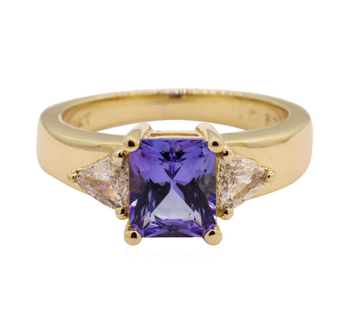 One electronically tested 14KT yellow gold lady's cast three stone straight line ring with a tapered shank with a bright polish finish. The featured lady's ring has a shank measuring 2.15 millimeters wide. Identified with markings of '14K'. Condition is like new, good workmanship. Containing: One prong set rectangular modified mixed cut natural tanzanite, measuring 6.95 x 5.95 x 4.11mm, (depth est.) approximate weight of 1.53ct., clarity is eye clean, medium light, moderately strong, bluish violet color, (GIA bV 4/4), cut is very good. Transmitting light with no distortion, transparent. Colored gemstones are presumed to have been subjected to commonly used enhancement processes. Graded in the setting. Two prong set triangle brilliant cut diamonds, measuring 4.00 x 3.90 x 2.15mm (depth est.) approximate total weight of 2 Stones = 0.38ct. Graded in the setting. Color H - I Clarity SI-1 Cut Very Good. Total Weight of Colored Stones 1.53ct.. Total Weight of Diamonds 0.38ct.. Total Weight of Ring 4.80gm GAS Appraised at  $2975.00. GAS Appraised.