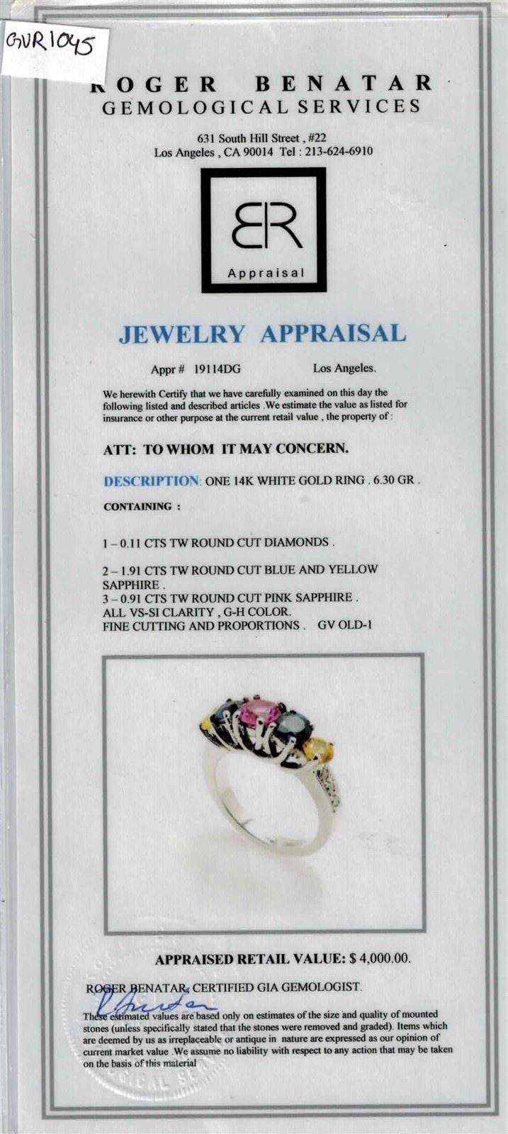 14K WHITE GOLD NATURAL CEYLON SAPPHIRE RING:5.59 GRAMS/DIAMOND:0.11CT/BLUE SAPPHIRE:1.91CT/PINK SAPPHIRE0.91CT/#GVR1045 **This artfully crafted 14K white gold ring invokes the vibrant spirit of a carnival. With a gleaming 0.91ct round cut Pink Sapphire, holding the pattern of the power of vulnerability, it is flanked with twin 1.91ct round cut Blue Sapphires and sparkling 0.11ct round cut Diamonds. This ring is an investment piece; the frolic is boundless.**