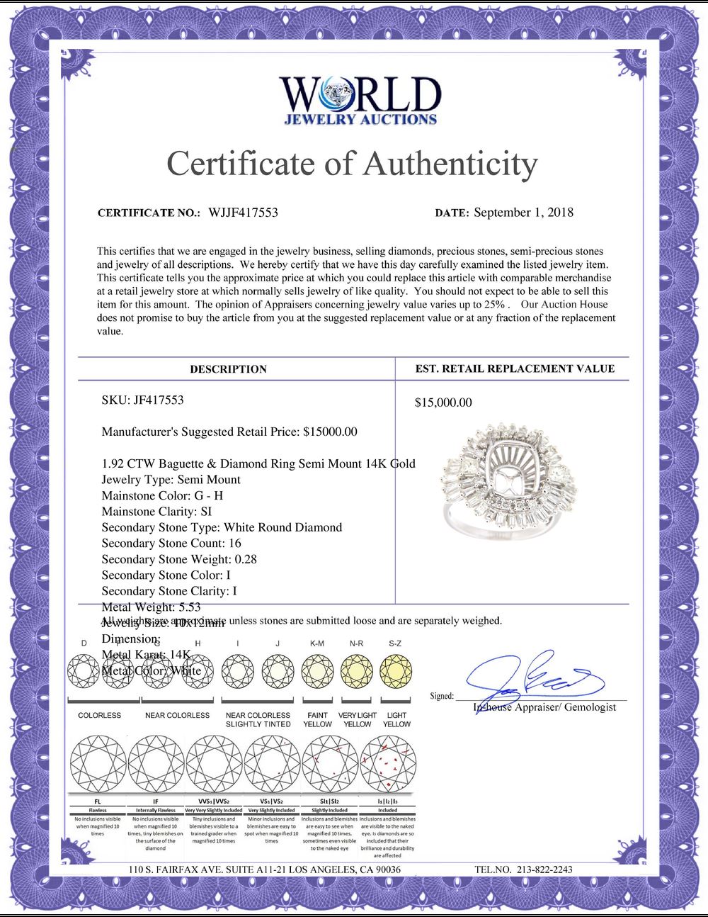 WORLD JEWELRY AUCTION believes to the best of its knowledge that the information presented in any listing has come from reliable sources. Such information is presented solely for the convenience of the Purchaser. WJA makes no warranties of any kind related to the information presented in any listing. WJA further makes no warranties, either express or implied, relating to the value, marketability or condition of the lot described in any listing. Prospective bidders should investigate a lot thoroughly before bidding. By bidding the Bidder acknowledges that Bidder has investigated the lot to his or her satisfaction, or, that Bidder has chosen not to do so, and agrees to accept the lot being bid on with no objections after the sale closes. If you are uncertain please contact us with your questions prior to bidding. If you are still uncertain after we reply, please refrain from bidding. Photos other graphic material contained in any listing of generic or duplicate lots may be stock presentations and not necessarily of the specific lot.