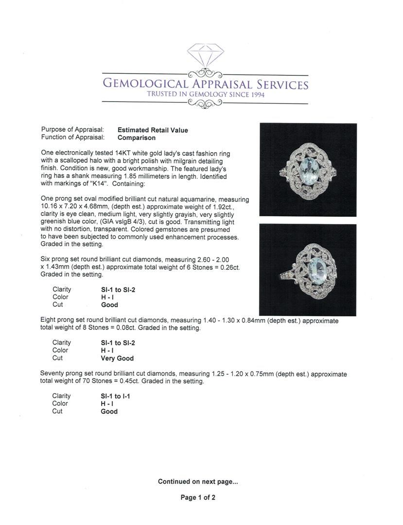One electronically tested 14KT white gold lady's cast fashion ring with a scalloped halo with a bright polish with milgrain detailing finish. The featured lady's ring has a shank measuring 1.85 millimeters in width. Identified with markings of "K14". Condition is new, good workmanship. Containing: One prong set oval modified brilliant cut natural aquamarine, measuring 10.16 x 7.20 x 4.68mm, (depth est.) approximate weight of 1.92ct., clarity is eye clean, medium light, very slightly grayish, very slightly greenish blue color, (GIA vslgB 4/3), cut is good. Transmitting light with no distortion, transparent. Colored gemstones are presumed to have been subjected to commonly used enhancement processes. Graded in the setting. Six prong set round brilliant cut diamonds, measuring 2.60 - 2.00 x 1.43mm (depth est.) approximate total weight of 6 Stones = 0.26ct. Graded in the setting. Clarity: SI-1 to SI-2. Color: H - I. Cut Good Eight prong set round brilliant cut diamonds, measuring 1.40 - 1.30 x 0.84mm (depth est.) approximate total weight of 8 Stones = 0.08ct. Graded in the setting. Clarity: SI-1 to SI-2. Color: H - I. Cut Very Good Seventy prong set round brilliant cut diamonds, measuring 1.25 - 1.20 x 0.75mm (depth est.) approximate total weight of 70 Stones = 0.45ct. Graded in the setting. Clarity: SI-1 to I-1. Color: H - I. Cut Good. Total Weight of Colored Stones 1.92ct. Total Weight of Diamonds 0.79ct. Total Weight of Ring 7.30gm. GAS Appraised at $4,975.00.
