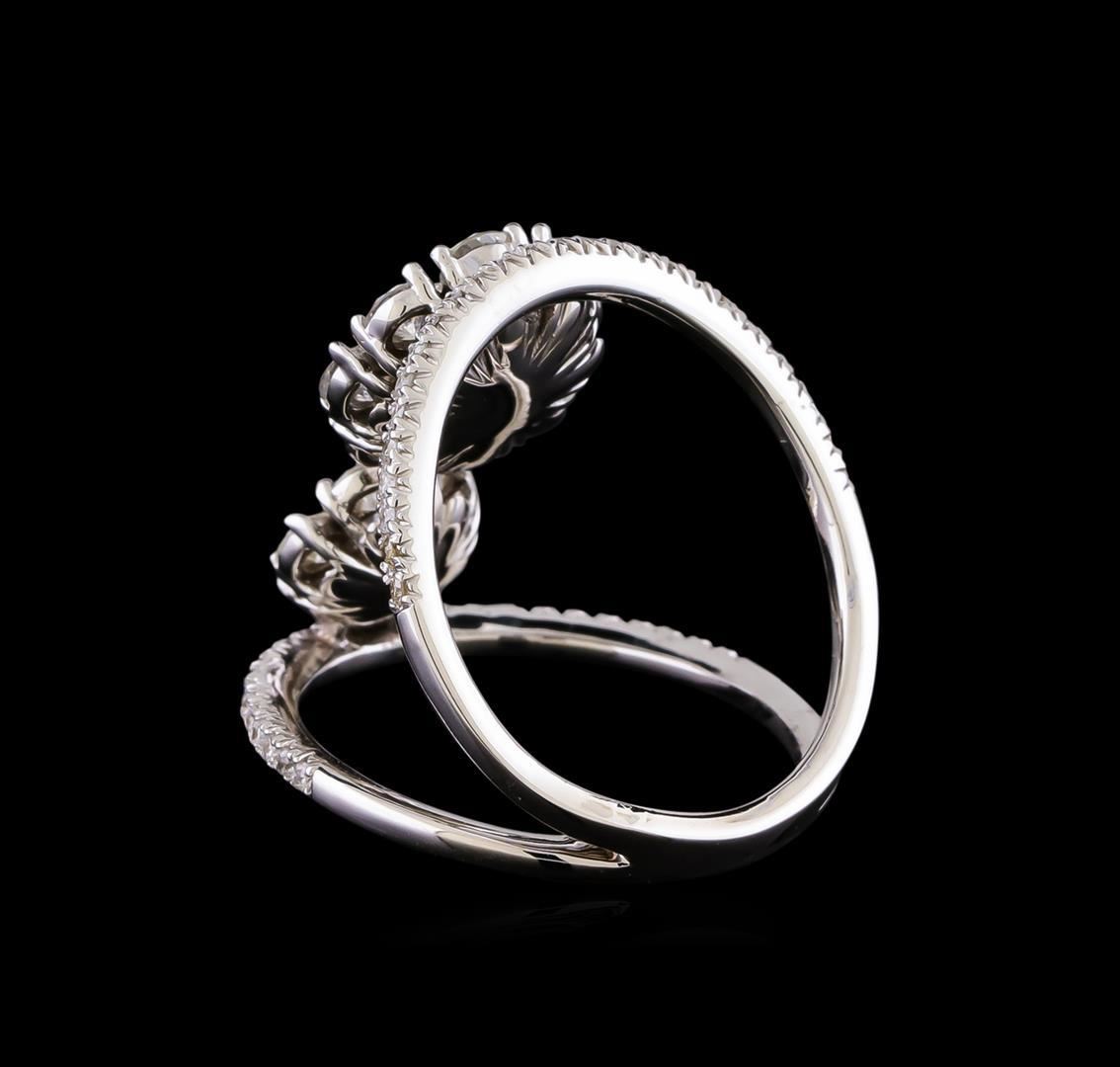 One electronically tested 14KT white gold lady's cast fashion split shank freeform ring with a bright polish finish. The featured lady's has a shank measuring 2.62 millimeters in width. Identified with markings of "K14". Condition is new, good workmanship. Containing: Nine prong set round brilliant cut diamonds, measuring 3.05 - 2.95 x 1.87mm (depth est.) approximate total weight of 9 Stones = 0.96ct. Graded in the setting. Clarity: VS-2 to SI-1. Color: H - I. Cut Very Good Six prong set round brilliant cut diamonds, measuring 2.70 - 2.60 x 1.67mm (depth est.) approximate total weight of 6 Stones = 0.46ct. Graded in the setting. Clarity: SI-1 to SI-2. Color: H - I. Cut Good Seven prong set round brilliant cut diamonds, measuring 1.80 - 1.70 x 1.07mm (depth est.) approximate total weight of 7 Stones = 0.15ct. Graded in the setting. Clarity: SI-1 to SI-2. Color: H - I. Cut Good Fifty-Two prong set round brilliant cut diamonds, measuring 1.25 - 1.20 x 0.75mm (depth est.) approximate total weight of 52 Stones = 0.35ct. Graded in the setting. Clarity: SI-1 to I-1. Color: H - I. Cut Good. Total Weight of Diamonds 1.92ct. Total Weight of Split Shank Freeform Ring 5.80gm. GAS Appraised.