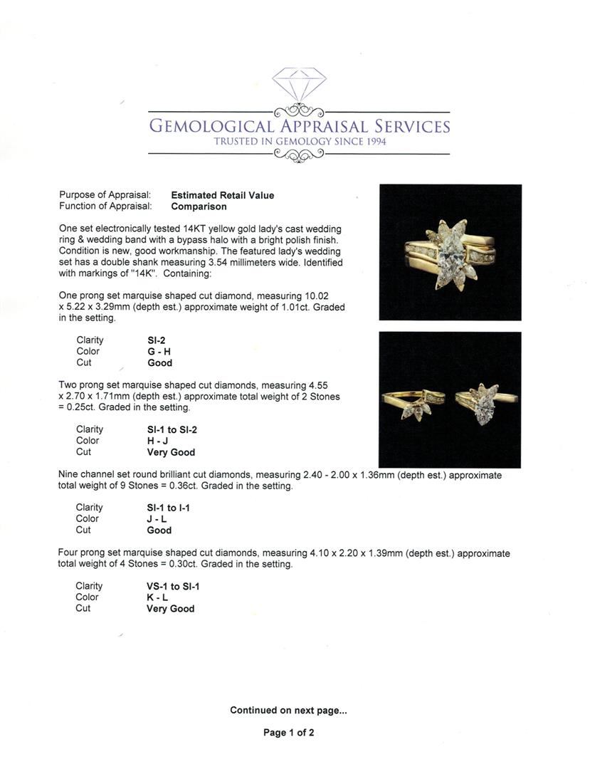 One set electronically tested 14KT yellow gold lady's cast wedding ring & wedding band with a bypass halo with a bright polish finish. The featured lady's wedding set has a double shank measuring 3.54 millimeters wide. Identified with markings of "14K". Condition is new, good workmanship. Containing: One prong set marquise shaped cut diamond, measuring 10.02 x 5.22 x 3.29mm (depth est.) approximate weight of 1.01ct. Graded in the setting. Clarity: SI-2. Color: G - Good Two prong set marquise shaped cut diamonds, measuring 4.55 x 2.70 x 1.71mm (depth est.) approximate total weight of 2 Stones = 0.25ct. Graded in the setting. Clarity: SI-1 to SI-2. Color: H - Very Good Nine channel set round brilliant cut diamonds, measuring 2.40 - 2.00 x 1.36mm (depth est.) approximate total weight of 9 Stones = 0.36ct. Graded in the setting. Clarity: SI-1 to I-1. Color: J - L. Cut Good Four prong set marquise shaped cut diamonds, measuring 4.10 x 2.20 x 1.39mm (depth est.) approximate total weight of 4 Stones = 0.30ct. Graded in the setting. Clarity: VS-1 to SI-1. Color: K - Very Good. Total Weight of Diamonds 1.92ct. Total Weight of Ring & Wedding Band 6.40gm GAS Appraised at $18,210.00.