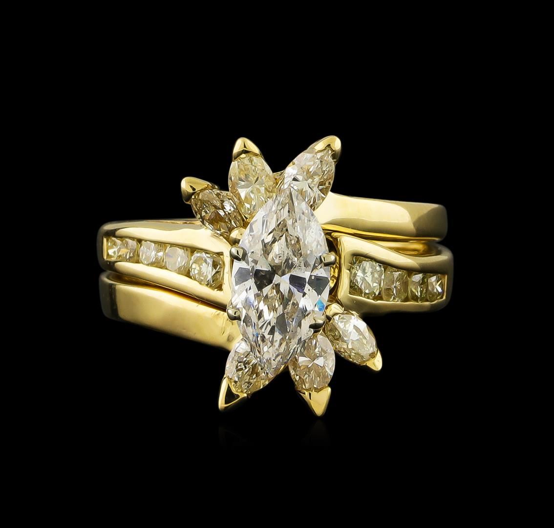 One set electronically tested 14KT yellow gold lady's cast wedding ring & wedding band with a bypass halo with a bright polish finish. The featured lady's wedding set has a double shank measuring 3.54 millimeters wide. Identified with markings of "14K". Condition is new, good workmanship. Containing: One prong set marquise shaped cut diamond, measuring 10.02 x 5.22 x 3.29mm (depth est.) approximate weight of 1.01ct. Graded in the setting. Clarity: SI-2. Color: G - Good Two prong set marquise shaped cut diamonds, measuring 4.55 x 2.70 x 1.71mm (depth est.) approximate total weight of 2 Stones = 0.25ct. Graded in the setting. Clarity: SI-1 to SI-2. Color: H - Very Good Nine channel set round brilliant cut diamonds, measuring 2.40 - 2.00 x 1.36mm (depth est.) approximate total weight of 9 Stones = 0.36ct. Graded in the setting. Clarity: SI-1 to I-1. Color: J - L. Cut Good Four prong set marquise shaped cut diamonds, measuring 4.10 x 2.20 x 1.39mm (depth est.) approximate total weight of 4 Stones = 0.30ct. Graded in the setting. Clarity: VS-1 to SI-1. Color: K - Very Good. Total Weight of Diamonds 1.92ct. Total Weight of Ring & Wedding Band 6.40gm GAS Appraised at $18,210.00.