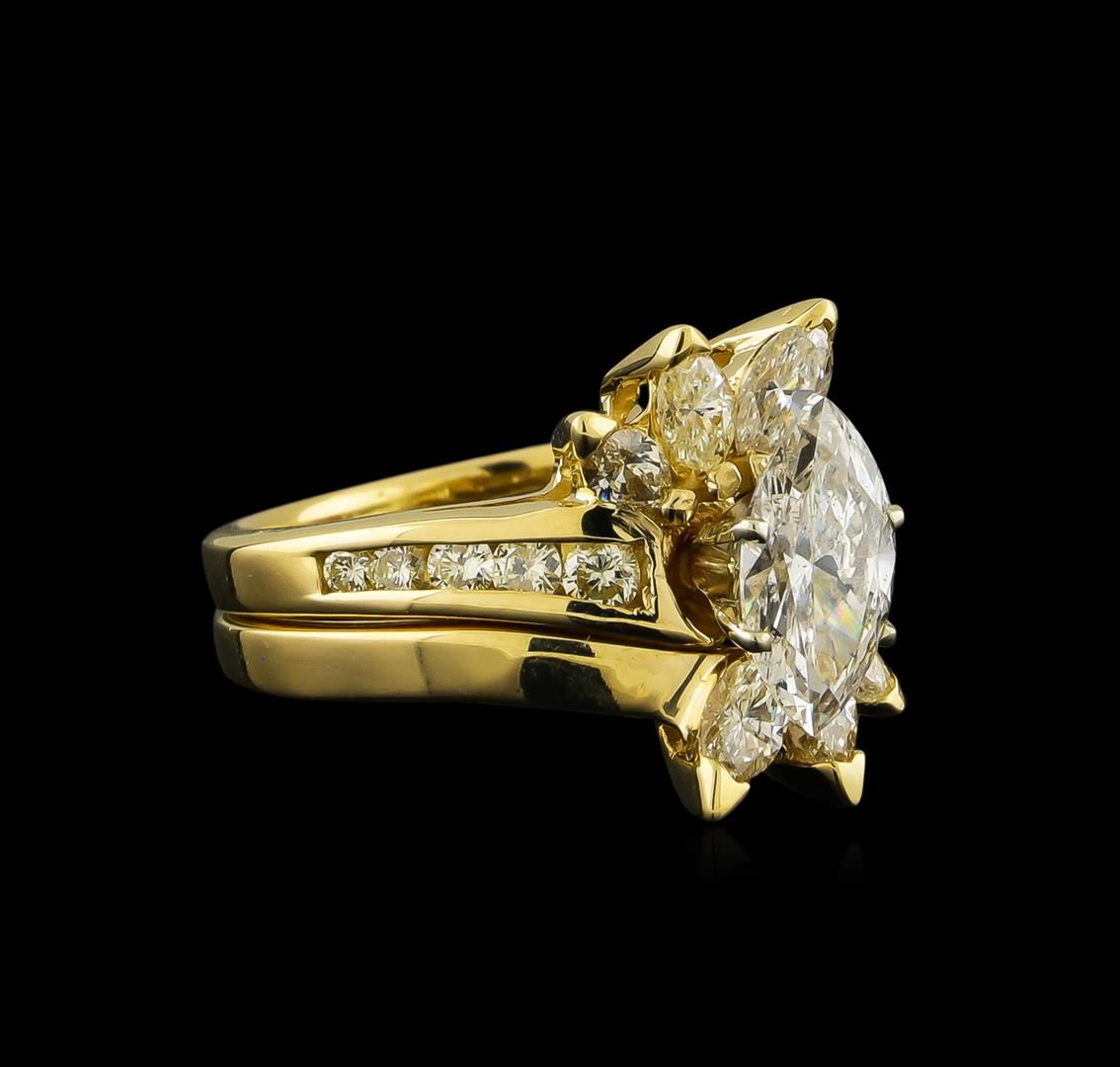 One set electronically tested 14KT yellow gold lady's cast wedding ring & wedding band with a bypass halo with a bright polish finish. The featured lady's wedding set has a double shank measuring 3.54 millimeters wide. Identified with markings of "14K". Condition is new, good workmanship. Containing: One prong set marquise shaped cut diamond, measuring 10.02 x 5.22 x 3.29mm (depth est.) approximate weight of 1.01ct. Graded in the setting. Clarity: SI-2. Color: G - Good Two prong set marquise shaped cut diamonds, measuring 4.55 x 2.70 x 1.71mm (depth est.) approximate total weight of 2 Stones = 0.25ct. Graded in the setting. Clarity: SI-1 to SI-2. Color: H - Very Good Nine channel set round brilliant cut diamonds, measuring 2.40 - 2.00 x 1.36mm (depth est.) approximate total weight of 9 Stones = 0.36ct. Graded in the setting. Clarity: SI-1 to I-1. Color: J - L. Cut Good Four prong set marquise shaped cut diamonds, measuring 4.10 x 2.20 x 1.39mm (depth est.) approximate total weight of 4 Stones = 0.30ct. Graded in the setting. Clarity: VS-1 to SI-1. Color: K - Very Good. Total Weight of Diamonds 1.92ct. Total Weight of Ring & Wedding Band 6.40gm GAS Appraised at $18,210.00.