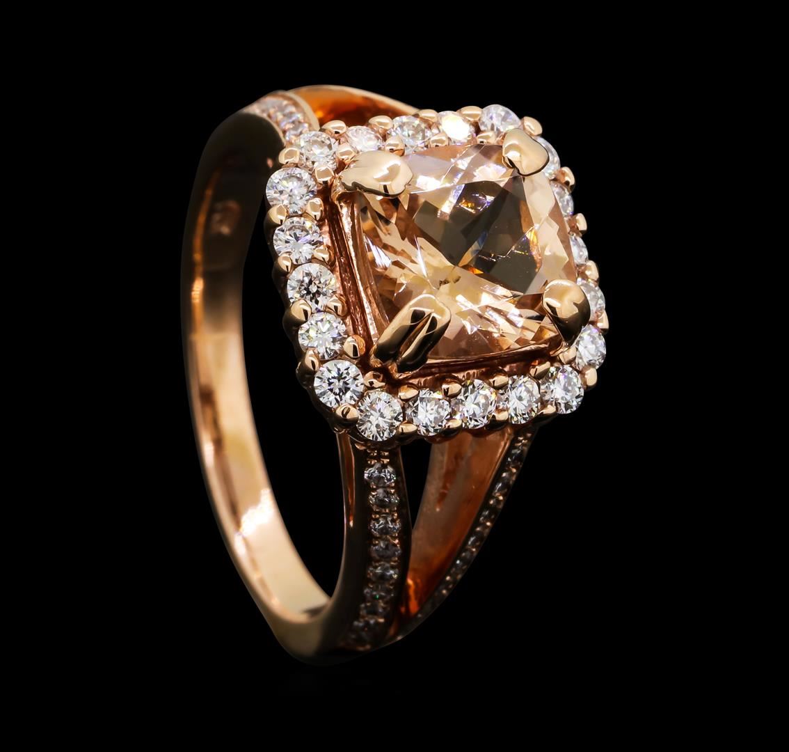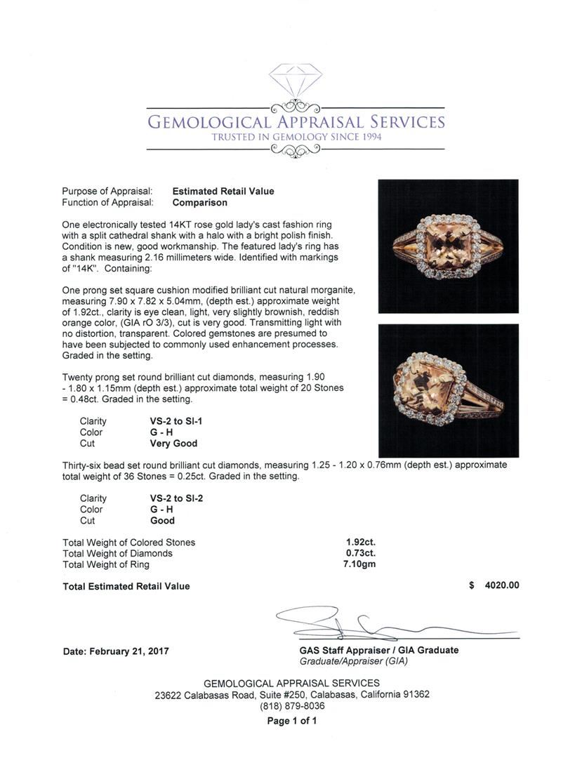 One electronically tested 14KT rose gold lady's cast fashion ring with a split cathedral shank with a halo with a bright polish finish. The featured lady's ring has a shank measuring 2.16 millimeters wide. Identified with markings of '14K'. Condition is new, good workmanship. Containing: One prong set square cushion modified brilliant cut natural morganite, measuring 7.90 x 7.82 x 5.04mm, (depth est.) approximate weight of 1.92ct., clarity is eye clean, light, very slightly brownish, reddish orange color, (GIA rO 3/3), cut is very good. Transmitting light with no distortion, transparent. Colored gemstones are presumed to have been subjected to commonly used enhancement processes. Graded in the setting. Twenty prong set round brilliant cut diamonds, measuring 1.90 - 1.80 x 1.15mm (depth est.) approximate total weight of 20 Stones = 0.48ct. Graded in the setting. Clarity VS-2 to SI-1. Color: G - H Cut Very Good Thirty-Six bead set round brilliant cut diamonds, measuring 1.25 - 1.20 x 0.76mm (depth est.) approximate total weight of 36 Stones = 0.25ct. Graded in the setting. Clarity VS-2 to SI-2. Color: G - H Cut Good. Total Weight of Colored Stones 1.92ct.. Total Weight of Diamonds 0.73ct.. Total Weight of Ring 7.10gm GAS Appraised at $4,020.00.