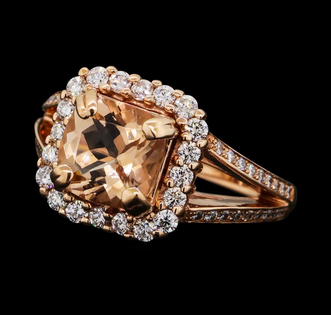 One electronically tested 14KT rose gold lady's cast fashion ring with a split cathedral shank with a halo with a bright polish finish. The featured lady's ring has a shank measuring 2.16 millimeters wide. Identified with markings of '14K'. Condition is new, good workmanship. Containing: One prong set square cushion modified brilliant cut natural morganite, measuring 7.90 x 7.82 x 5.04mm, (depth est.) approximate weight of 1.92ct., clarity is eye clean, light, very slightly brownish, reddish orange color, (GIA rO 3/3), cut is very good. Transmitting light with no distortion, transparent. Colored gemstones are presumed to have been subjected to commonly used enhancement processes. Graded in the setting. Twenty prong set round brilliant cut diamonds, measuring 1.90 - 1.80 x 1.15mm (depth est.) approximate total weight of 20 Stones = 0.48ct. Graded in the setting. Clarity VS-2 to SI-1. Color: G - H Cut Very Good Thirty-Six bead set round brilliant cut diamonds, measuring 1.25 - 1.20 x 0.76mm (depth est.) approximate total weight of 36 Stones = 0.25ct. Graded in the setting. Clarity VS-2 to SI-2. Color: G - H Cut Good. Total Weight of Colored Stones 1.92ct.. Total Weight of Diamonds 0.73ct.. Total Weight of Ring 7.10gm GAS Appraised at $4,020.00.