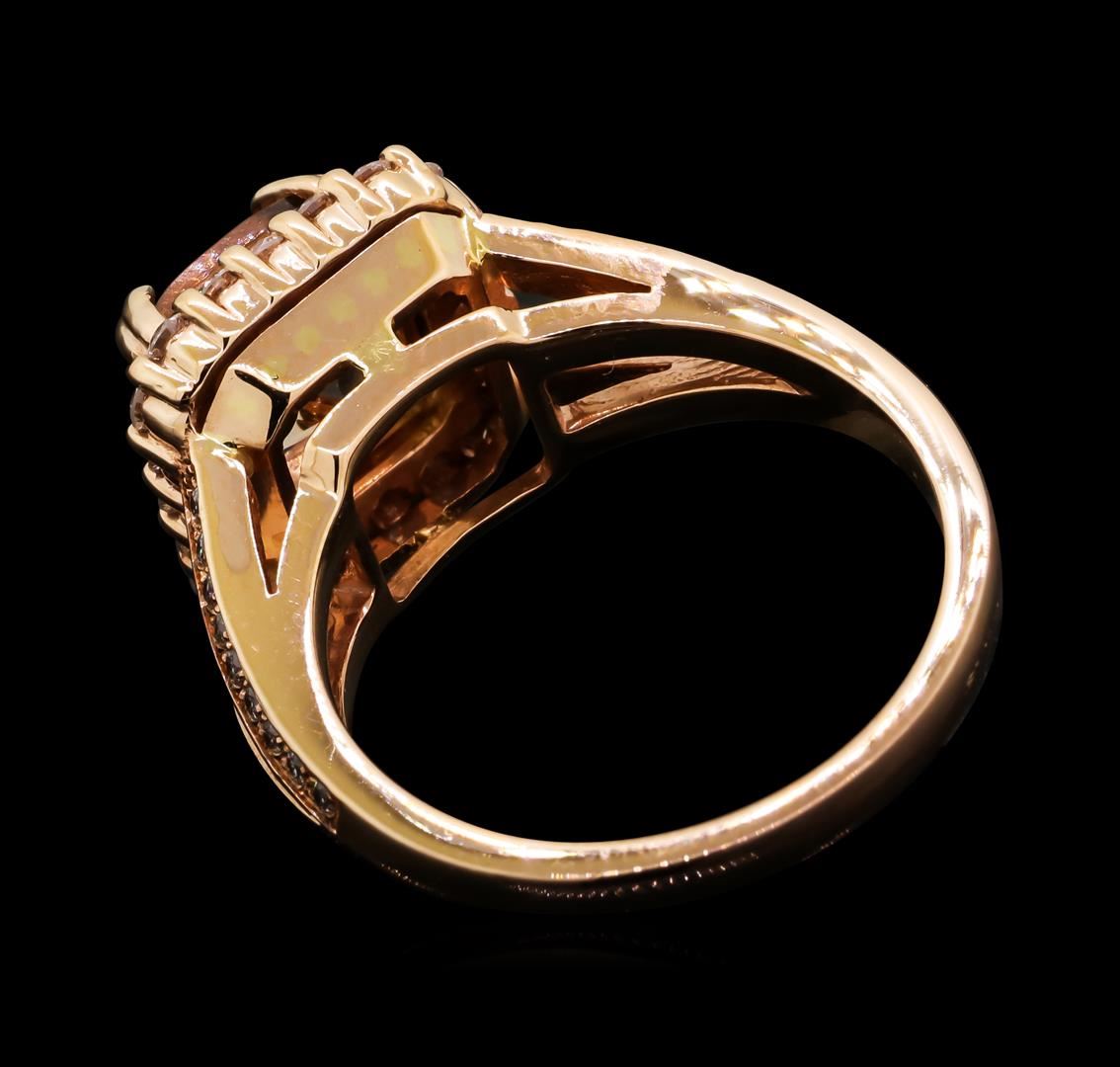 One electronically tested 14KT rose gold lady's cast fashion ring with a split cathedral shank with a halo with a bright polish finish. The featured lady's ring has a shank measuring 2.16 millimeters wide. Identified with markings of '14K'. Condition is new, good workmanship. Containing: One prong set square cushion modified brilliant cut natural morganite, measuring 7.90 x 7.82 x 5.04mm, (depth est.) approximate weight of 1.92ct., clarity is eye clean, light, very slightly brownish, reddish orange color, (GIA rO 3/3), cut is very good. Transmitting light with no distortion, transparent. Colored gemstones are presumed to have been subjected to commonly used enhancement processes. Graded in the setting. Twenty prong set round brilliant cut diamonds, measuring 1.90 - 1.80 x 1.15mm (depth est.) approximate total weight of 20 Stones = 0.48ct. Graded in the setting. Clarity VS-2 to SI-1. Color: G - H Cut Very Good Thirty-Six bead set round brilliant cut diamonds, measuring 1.25 - 1.20 x 0.76mm (depth est.) approximate total weight of 36 Stones = 0.25ct. Graded in the setting. Clarity VS-2 to SI-2. Color: G - H Cut Good. Total Weight of Colored Stones 1.92ct.. Total Weight of Diamonds 0.73ct.. Total Weight of Ring 7.10gm GAS Appraised at $4,020.00.