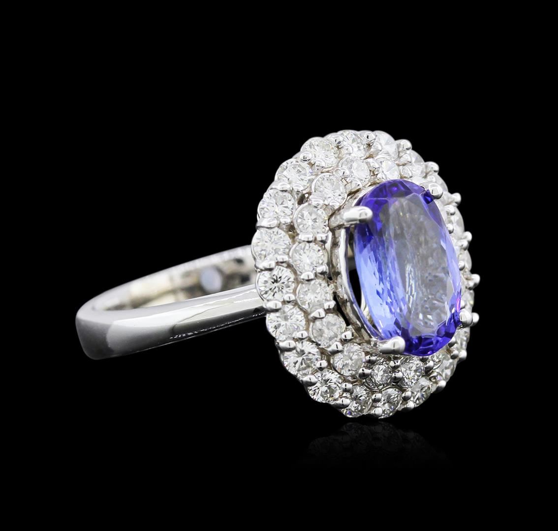 One electronically tested 14KT white gold ladies cast tanzanite and diamond ring with a bright polish finish. The featured tanzanite is set within tiered diamond bezels, completed by a three millimeter wide band. Identified with markings of "K14". Condition is new, good workmanship. Containing: One prong set oval mixed cut natural tanzanite approximate weight of 1.92ct., clarity is eye clean, type I, medium dark, very slightly grayish, bluish violet color, (GIA bV 6/3), cut is good. Transmitting light with no distortion, transparent. Graded in the setting. Tanzanite is a very rare gemstone that is only found in the country of Tanzania. Originally discovered in 1967. Tiffany & Company, named the stone Tanzanite. It is found in the Usumburu Mountains that border the Umba Valley of northern Tanzania. Tanzanite occurs in gray, brown, violet, blue, reddish-purple, & green. The gem is interesting because of its exceptional pleochroism. Rotated in different directions a tanzanite will exhibit multiple changes of color. Tanzanite has a low tolerance to ultrasonic cleaning, and should not be cleaned using this method. Thirty-Six prong set round brilliant cut diamonds approximate total weight of 36 Stones = 1.00ct. Graded in the setting. Clarity SI-2 to I-1 Color H - J. Total Weight of Colored Stones 1.92ct. Total Weight of Diamonds 1.00ct. Total Weight of Ring 5.97 grams. AIG Appraised at $7,325.00.