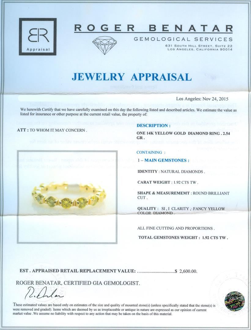 One 14KT yellow gold ring weighing 2.54 grams containing diamonds with SI-I clarity and fancy yellow color weighing 1.92ctw. RBGS Appraised at $2,600.00.