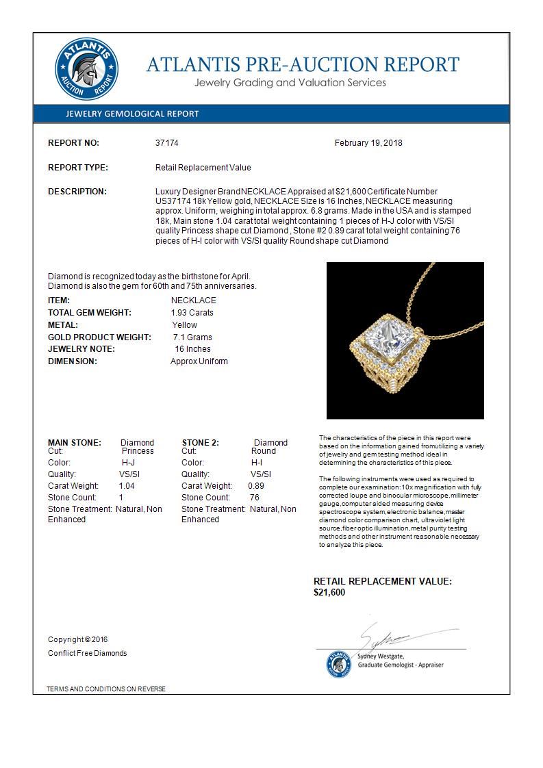 REF-436T4M -37174 ---- 1.93 CTW Princess VS/SI Diamond Solitaire Micro Pave Necklace 18K Yellow Gold ---- Luxury Designer Brand NECKLACE Appraised at $21,600 Certificate Number US37174 18k Yellow gold, NECKLACE Size is 16 Inches, NECKLACE measuring approx. Uniform, weighing in total approx. 6.8 grams. Made in the USA and is stamped 18k, Main stone 1.04 carat total weight containing 1 pieces of H-J color with VS/SI quality Princess shape cut Diamond , Stone #2 0.89 carat total weight containing 76 pieces of H-I color with VS/SI quality Round shape cut Diamond
