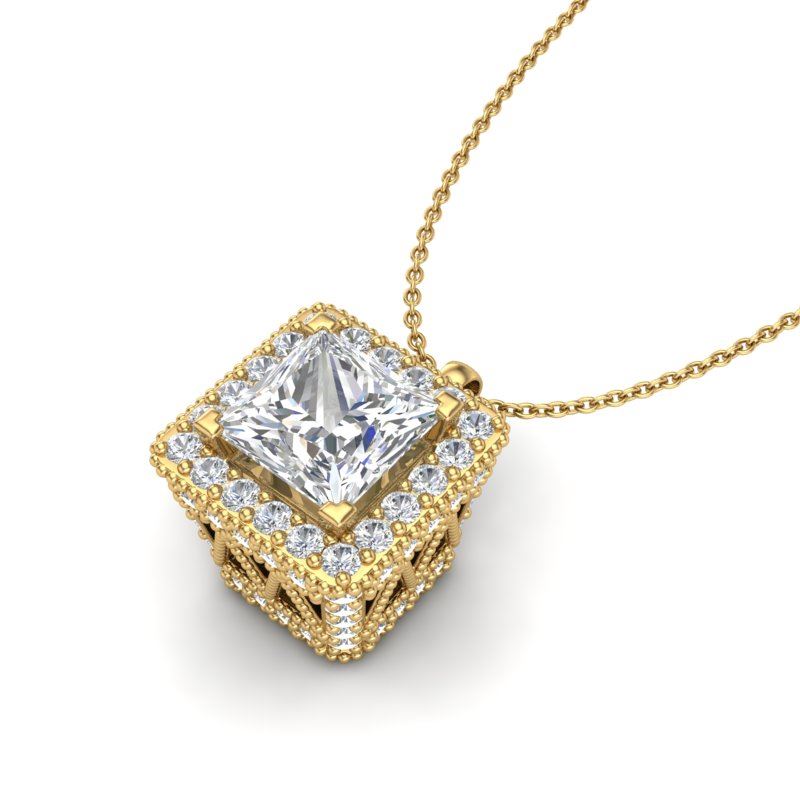 1.93 CTW Princess VS/SI Diamond Solitaire Micro Pave Necklace 18K Yellow Gold ---- Luxury Designer Brand NECKLACE Appraised Retail Price at $21,600 ---- SKU Number US37174 18k Yellow gold NECKLACE Size is 16 Inches, NECKLACE measuring approx. Uniform, weighing in total approx. 6.8 grams. Made in the USA and is stamped 18k, Main stone 1.04 carat total weight containing 1 pieces of H-J color with VS/SI quality Princess shape cut Diamond , Stone #2 0.89 carat total weight containing 76 pieces of H-I color with VS/SI quality Round shape cut