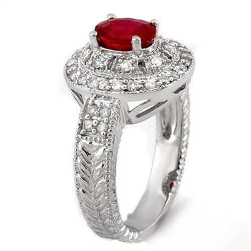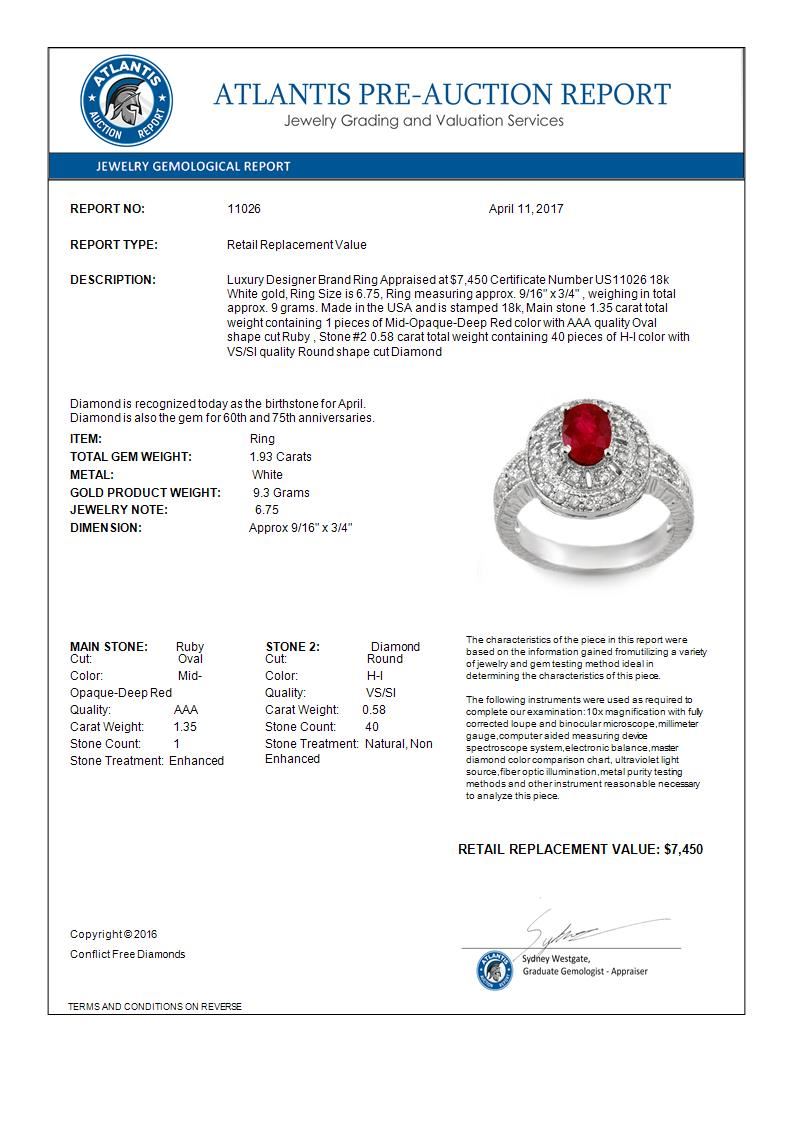 1.93 CTW Ruby & Diamond Ring 18K White Gold ---- Luxury Designer Brand Ring Appraised Retail Price at $7,450 ---- SKU Number US11026 18k White gold Ring Size is 6.75, Ring measuring approx. 9/16" x 3/4" , weighing in total approx. 9 grams. Made in the USA and is stamped 18k, Main stone 1.35 carat total weight containing 1 pieces of Mid-Opaque-Deep Red color with AAA quality Oval shape cut Ruby , Stone #2 0.58 carat total weight containing 40 pieces of H-I color with VS/SI quality Round shape cut