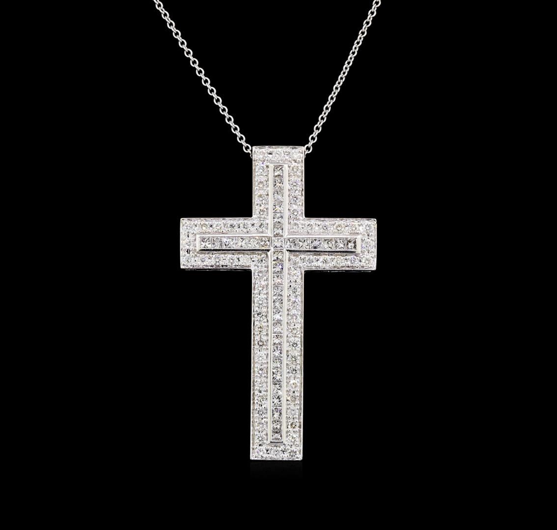 One electronically tested 18KT white gold cast & assembled diamond cross pendant with chain. One and three-quarter inch length pendant features a diamond set cross, completed by a hidden bail. The pendant is supported by a sixteen inch length 14KT white gold cable chain, terminating in a lobster claw clasp. Bright polish finish. Identified with markings of "750". Condition is new, good workmanship. Containing: Twenty-Three channel set princess cut diamonds, measuring 1.90 x 1.70 x 1.28mm (depth est.) approximate total weight of 23 Stones = 0.75ct. Graded in the setting. Clarity: VS-2 to SI-2. Color: F - H Sixty-Six prong set round brilliant cut diamonds, measuring 1.70 - 1.65 x 1.01mm (depth est.) approximate total weight of 66 Stones = 1.18ct. Graded in the setting. Clarity: SI-2 to I-1. Color: G - I. Total Weight of Diamonds 1.93ct. Total Weight of Pendant With Chain 11.03gm. AIG Appraised at $7,605.00.