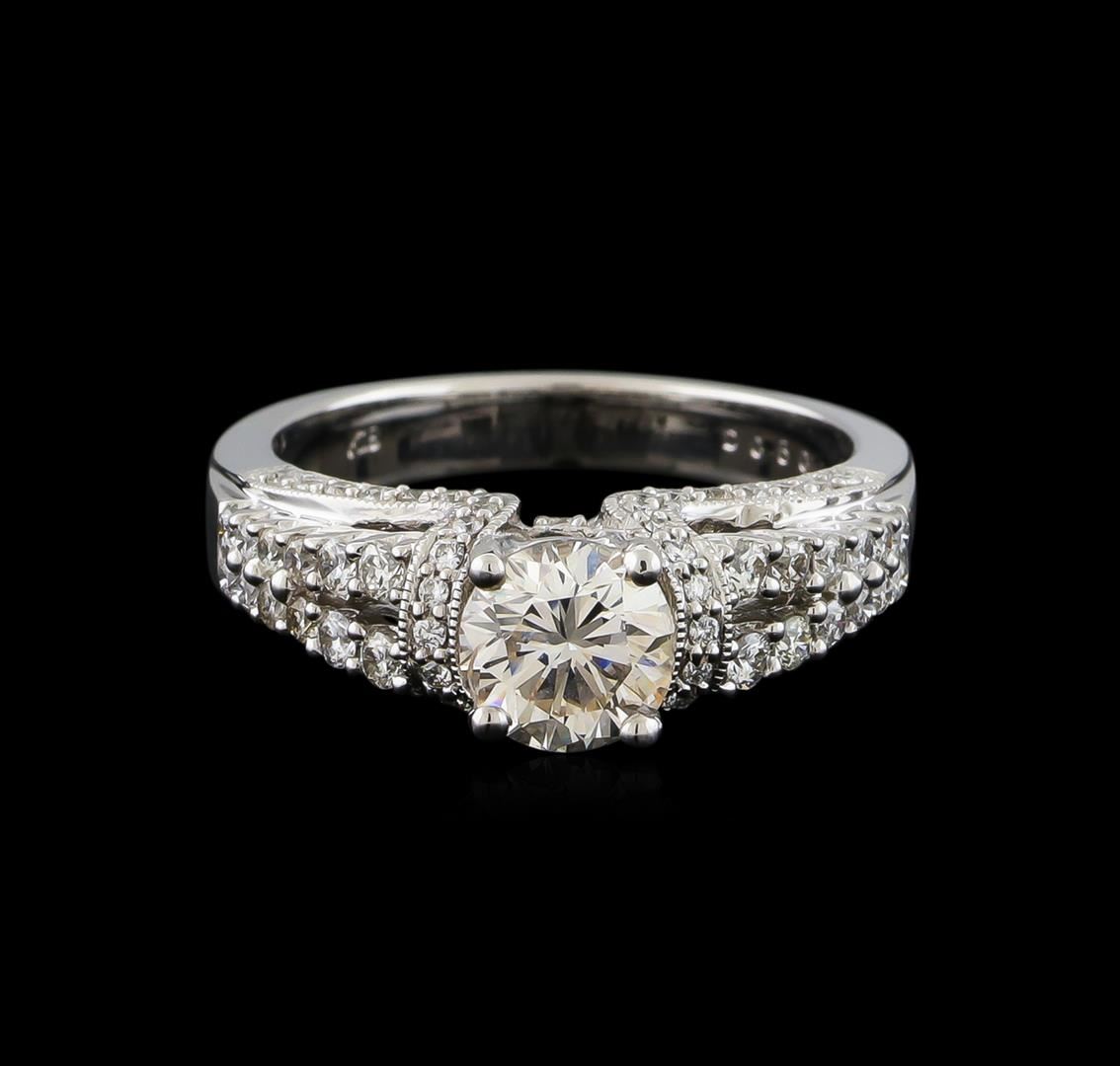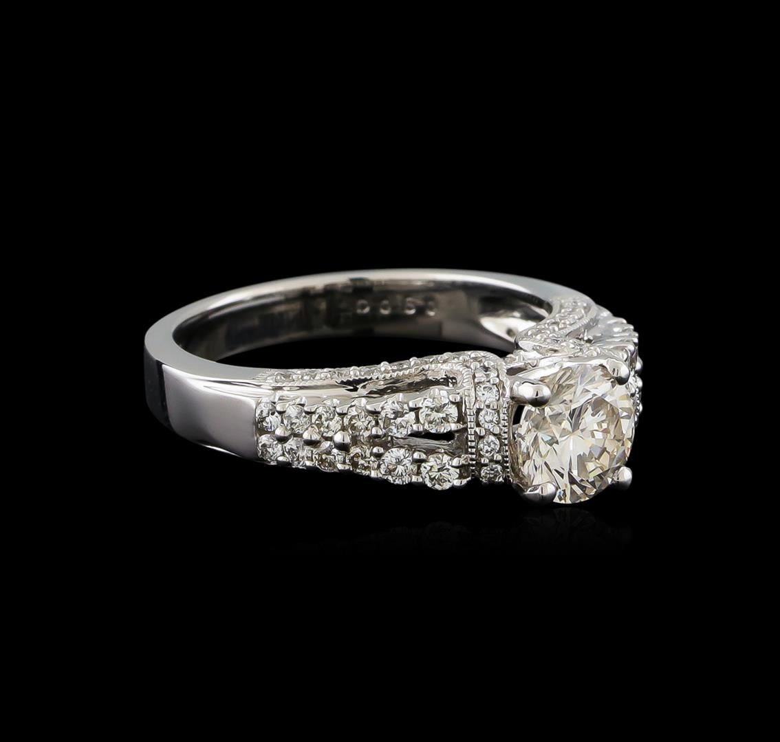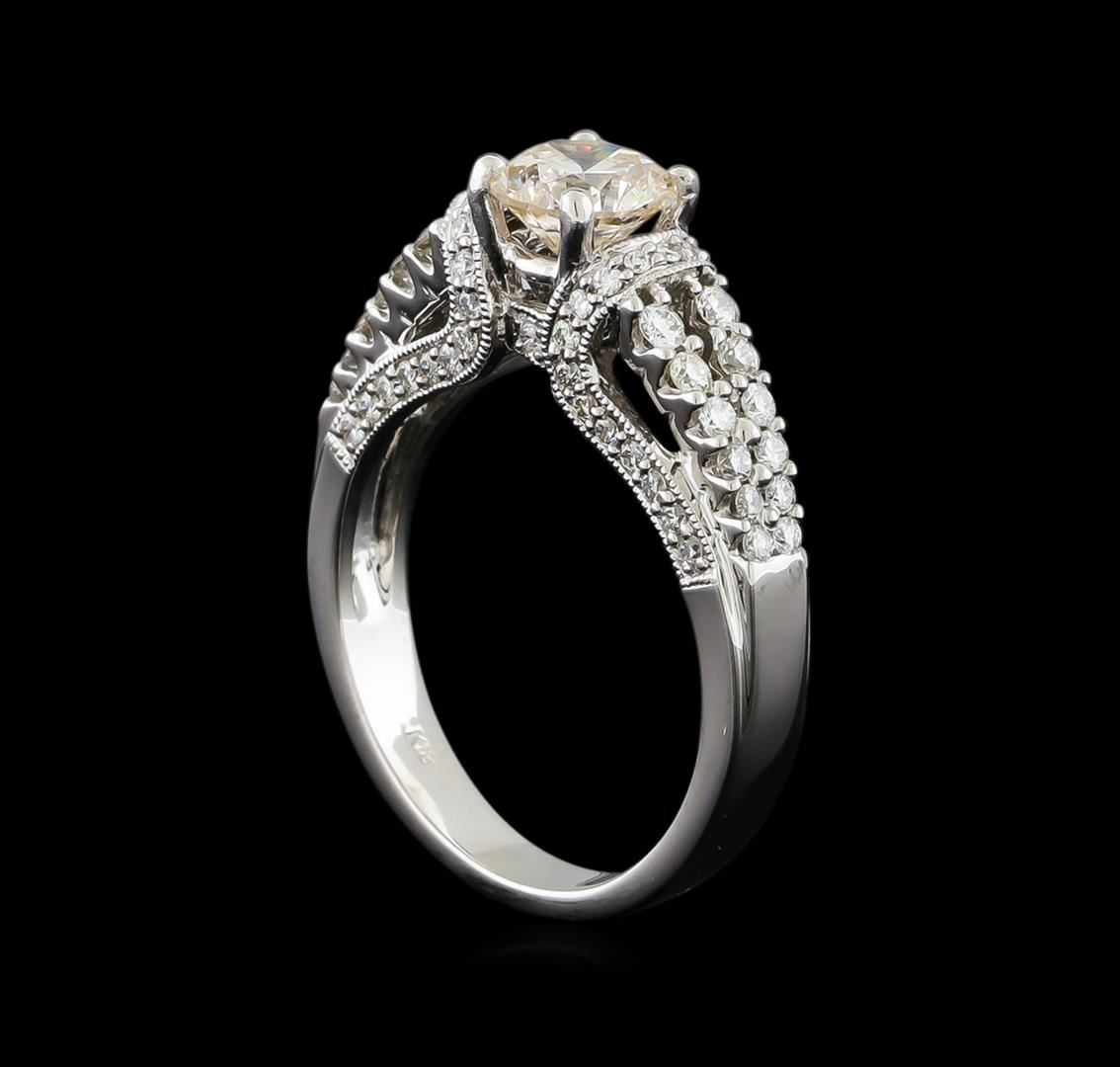One electronically tested 18KT white gold lady's cast wedding ring with a cathedral split shank with a bright polish with milgrain detailing finish. The featured lady's ring has a shank measuring 3.00 millimeters wide. Identified with markings of "K18". Condition is new, good workmanship. Containing: One prong set round brilliant cut diamond, measuring 6.29 - 6.25 x 4.04mm (depth est.) , 5.00.%. GTCF approximate weight of 1.03ct. Graded in the setting. Clarity: SI-1. Color: H - I. Cut Very Good Twenty-Four prong set round brilliant cut diamonds, measuring 1.80 - 1.50 x 1.04mm (depth est.) approximate total weight of 24 Stones = 0.42ct. Graded in the setting. Clarity: SI-1 to I-1. Color: G - I. Cut Very Good Forty-Eight prong set round brilliant cut diamonds, measuring 1.40 - 1.30 x 0.84mm (depth est.) approximate total weight of 48 Stones = 0.48ct. Graded in the setting. Clarity: SI-1 to I-1. Color: G - Good. Total Weight of Diamonds 1.93ct. Total Weight of Ring 6.20gm GAS Appraised at $15,095.00.