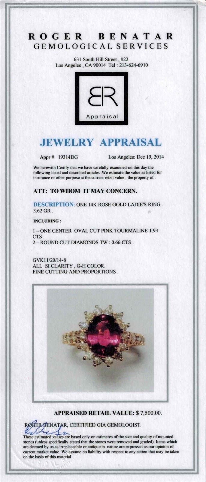 14K ROSE GOLD NATURAL PINK COPPER BEARING PARAIBA TOURMALINE RING:3.62 GRAMS/DIAMOND:0.66CT/PINK COPPER BEARING PARAIBA TOURMALINE:1.93CT/#GVR1040 **Warmly crafted in 14k rose gold, this 1.93ct oval cut Pink Tourmaline softly sings lullabies of its delicate beauty. Known as the quintessential heart chakra stone, its brilliant hue is brightened by a glittering 0.66ct round cut Diamond accent surround, and the stepped detailing on the sides of the shank adds textural appeal.**