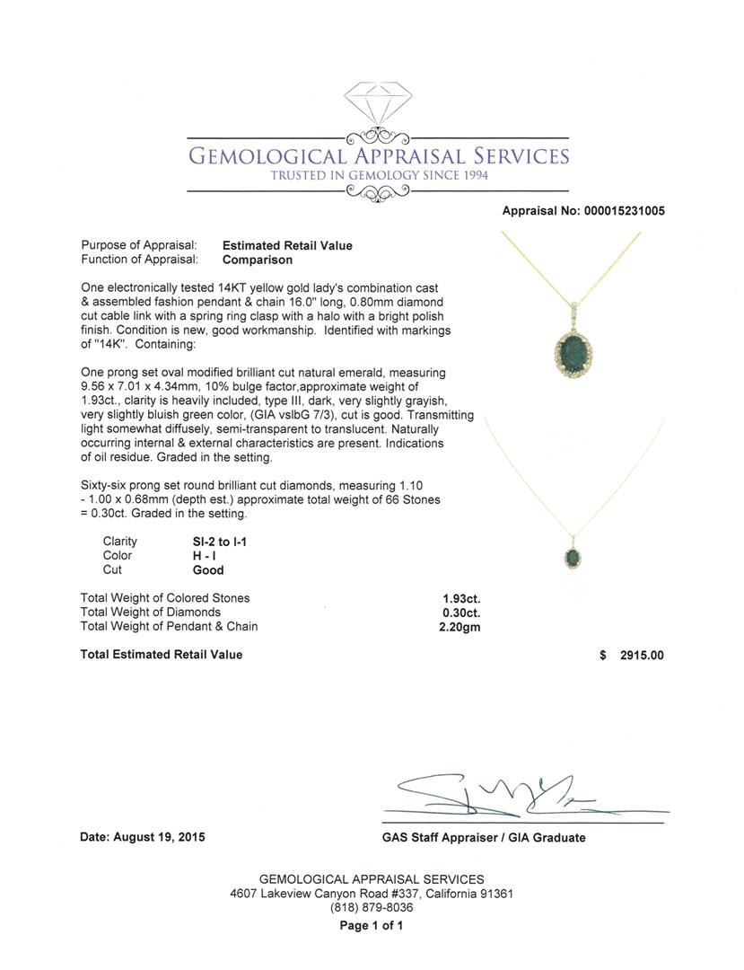 One electronically tested 14KT yellow gold lady's combination cast & assembled fashion pendant & chain 16.0" long, 0.80mm diamond cut cable link with a spring ring clasp with a halo with a bright polish finish. Identified with markings of "14K". Condition is new, good workmanship. Containing: One prong set oval modified brilliant cut natural emerald, measuring 9.56 x 7.01 x 4.34mm, 10% bulge factor, approximate weight of 1.93ct., clarity is heavily included, type III, dark, very slightly grayish, very slightly bluish green color, (GIA vslbG 7/3), cut is good. Transmitting light somewhat diffusely, semi-transparent to translucent. Naturally occurring internal & external characteristics are present. Indications of oil residue. Graded in the setting. Sixty-Six prong set round brilliant cut diamonds, measuring 1.10 - 1.00 x 0.68mm (depth est.) approximate total weight of 66 Stones = 0.30ct. Graded in the setting. Clarity: SI-2 to I-1. Color: H - I. Cut Good. Total Weight of Colored Stones 1.93ct. Total Weight of Diamonds 0.30ct. Total Weight of Pendant & Chain 2.20gm. GAS Appraised at $2,915.00.