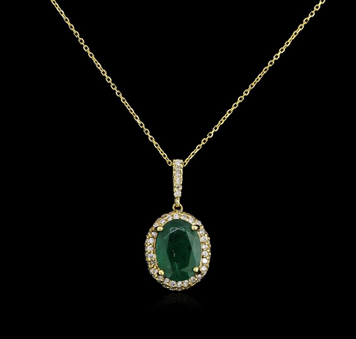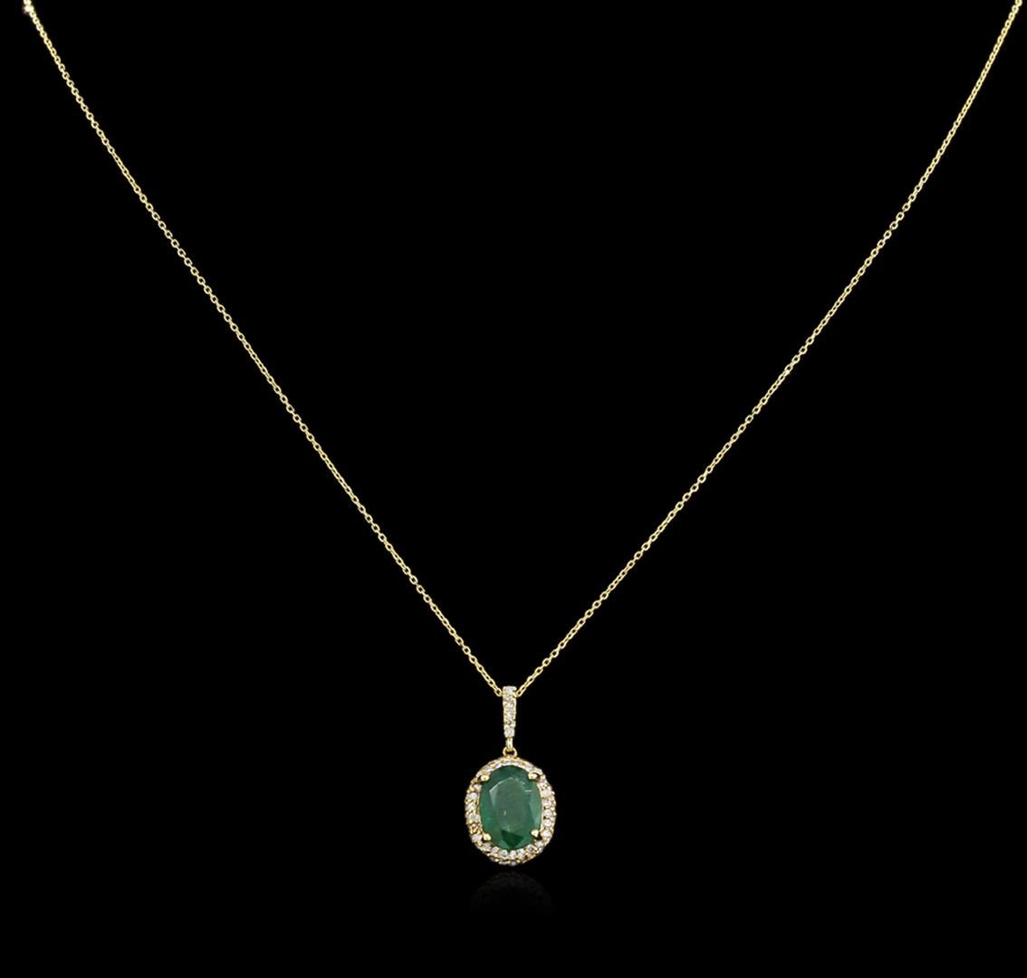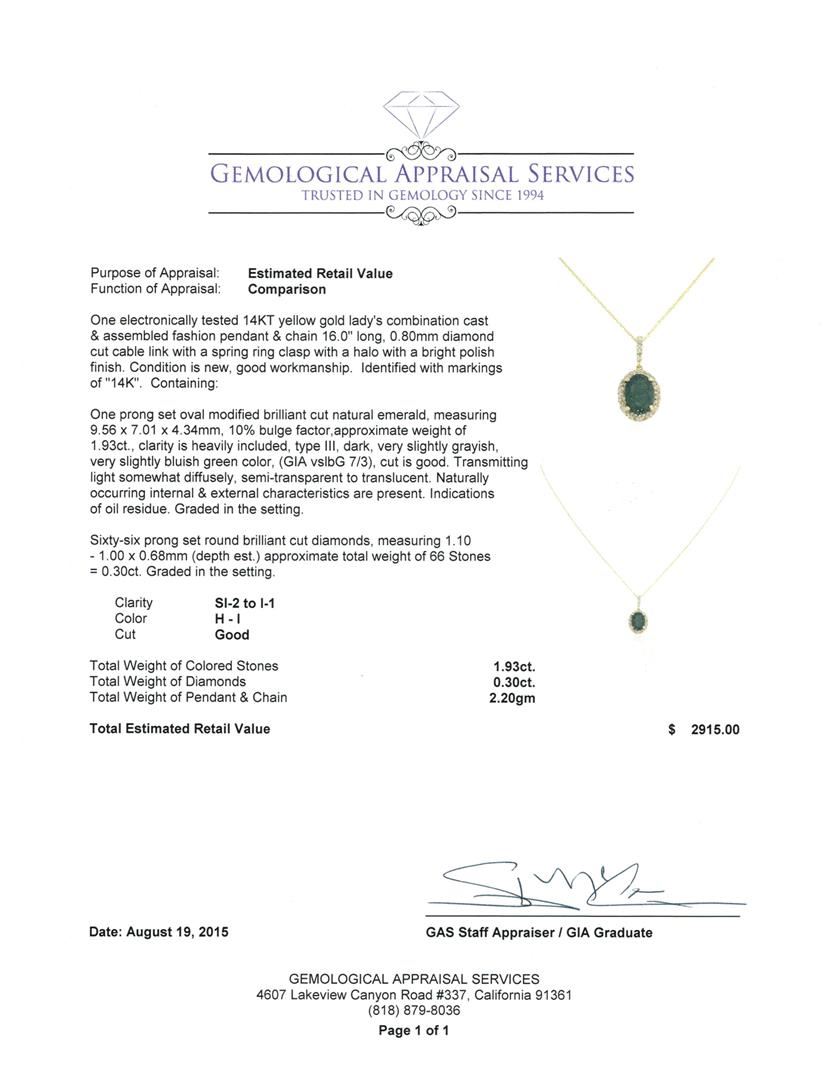 One electronically tested 14KT yellow gold lady's combination cast & assembled fashion pendant & chain 16.0" long, 0.80mm diamond cut cable link with a spring ring clasp with a halo with a bright polish finish. Identified with markings of "14K". Condition is new, good workmanship. Containing: One prong set oval modified brilliant cut natural emerald, measuring 9.56 x 7.01 x 4.34mm, 10% bulge factor, approximate weight of 1.93ct., clarity is heavily included, type III, dark, very slightly grayish, very slightly bluish green color, (GIA vslbG 7/3), cut is good. Transmitting light somewhat diffusely, semi-transparent to translucent. Naturally occurring internal & external characteristics are present. Indications of oil residue. Graded in the setting. Sixty-Six prong set round brilliant cut diamonds, measuring 1.10 - 1.00 x 0.68mm (depth est.) approximate total weight of 66 Stones = 0.30ct. Graded in the setting. Clarity: SI-2 to I-1. Color: H - I. Cut Good. Total Weight of Colored Stones 1.93ct. Total Weight of Diamonds 0.30ct. Total Weight of Pendant & Chain 2.20gm. GAS Appraised at $2,915.00.