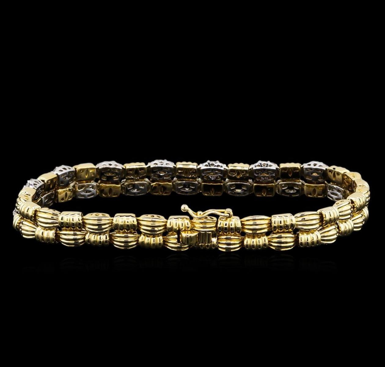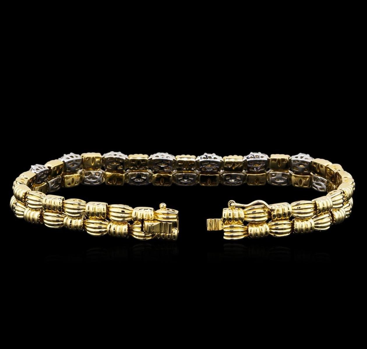 One electronically tested 14KT white and yellow gold lady's combination cast & assembled fashion bracelet with a tongue clasp with foldover safety with a bright polish finish. The featured lady's bracelet has a basket weave motif and measures approximately 7.9 millimeters in width and 7.25 inches in length. Identified with markings of "K14". Condition is new, good workmanship. Containing: Sixty prong set round brilliant cut diamonds, measuring 1.70 - 1.65 x 1.06mm (depth est.) approximate total weight of 60 Stones = 1.10ct. Graded in the setting. Clarity: SI-1 to SI-2. Color: H - I. Cut Good Thirty prong set round brilliant cut diamonds, measuring 2.00 - 1.90 x 1.21mm (depth est.) approximate total weight of 30 Stones = 0.84ct. Graded in the setting. Clarity: SI-1 to SI-2. Color: H - I. Cut Good. Total Weight of Diamonds 1.94ct. Total Weight of Bracelet 23.90gm. GAS Appraised.