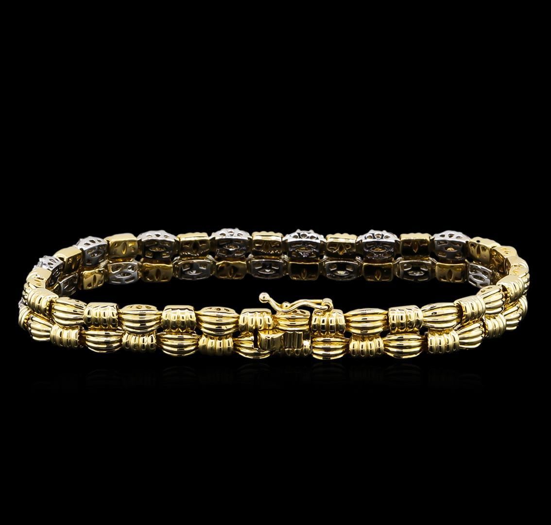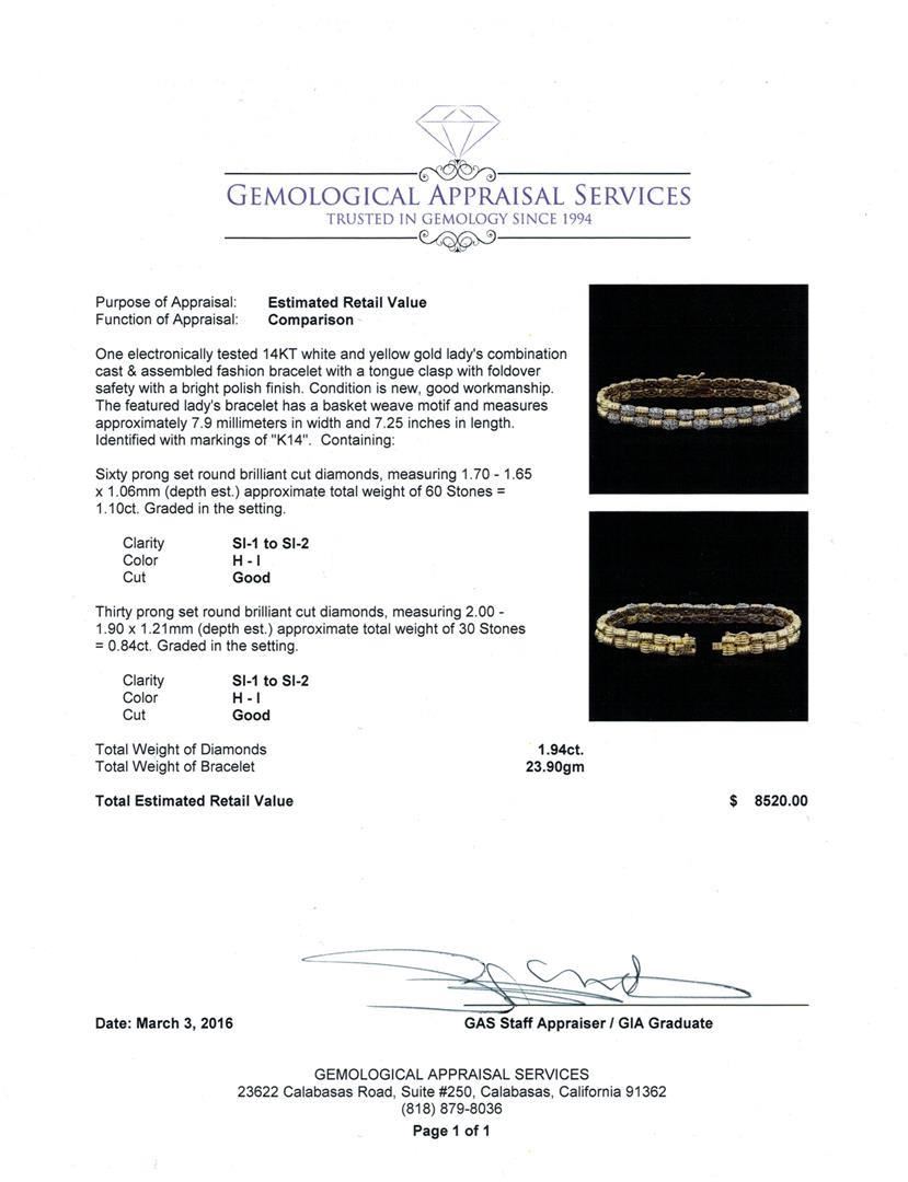 One electronically tested 14KT white and yellow gold lady's combination cast & assembled fashion bracelet with a tongue clasp with foldover safety with a bright polish finish. The featured lady's bracelet has a basket weave motif and measures approximately 7.9 millimeters in width and 7.25 inches in length. Identified with markings of "K14". Condition is new, good workmanship. Containing: Sixty prong set round brilliant cut diamonds, measuring 1.70 - 1.65 x 1.06mm (depth est.) approximate total weight of 60 Stones = 1.10 ct. Graded in the setting. Clarity: SI-1 to SI-2. Color: H - I. Cut Good Thirty prong set round brilliant cut diamonds, measuring 2.00 - 1.90 x 1.21mm (depth est.) approximate total weight of 30 Stones = 0.84ct. Graded in the setting. Clarity: SI-1 to SI-2. Color: H - I. Cut Good. Total Weight of Diamonds 1.94ct. Total Weight of Bracelet 23.90gm. GAS Appraised.