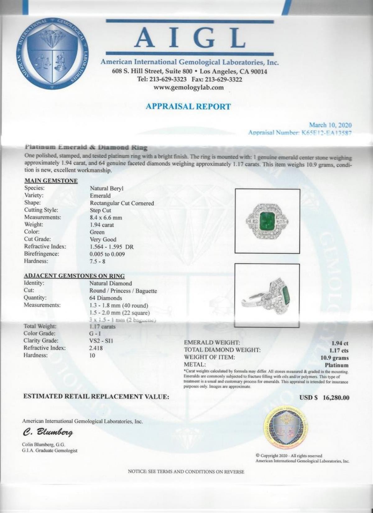 One 1.94ct Emerald and Diamond Ring - Platinum. AIG certified. See Appraisal for more details. AIG Appraised.