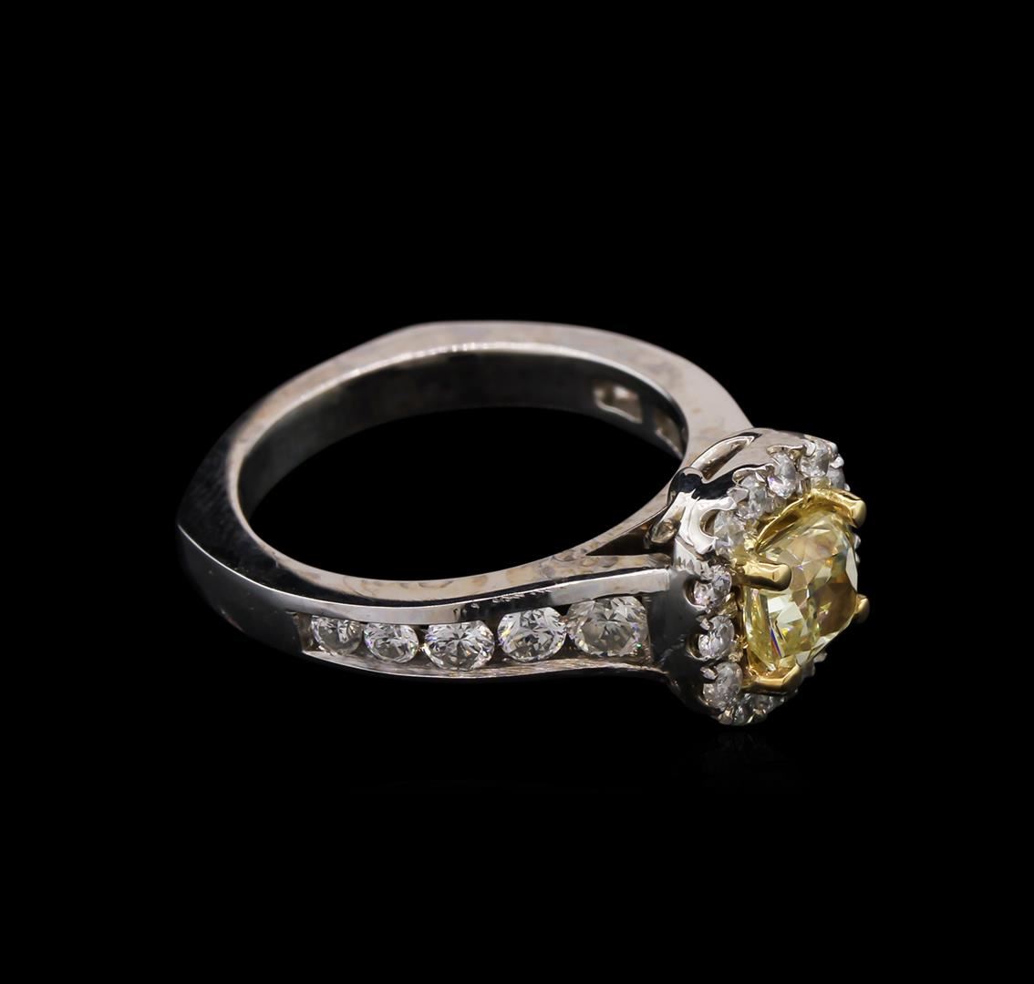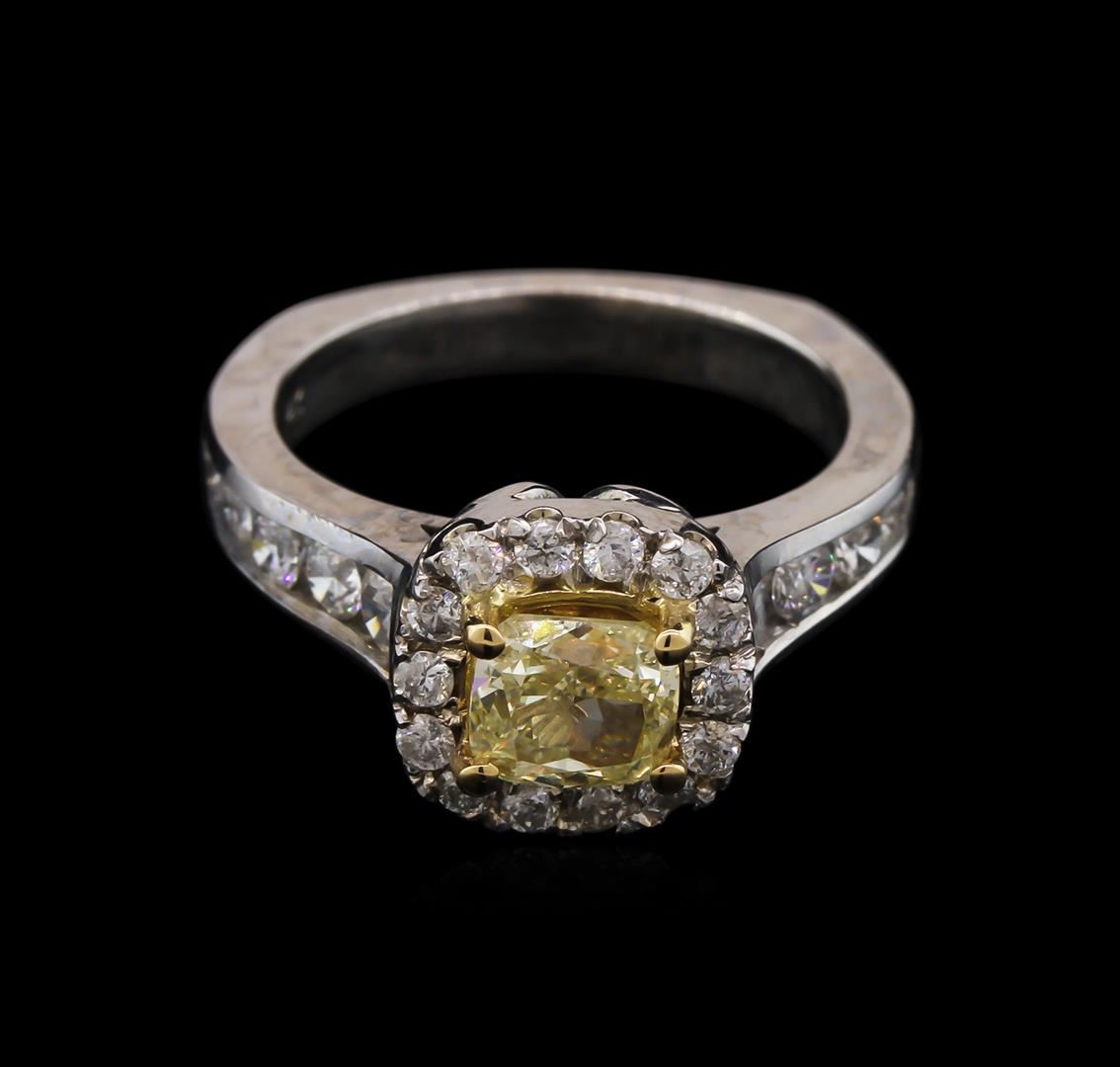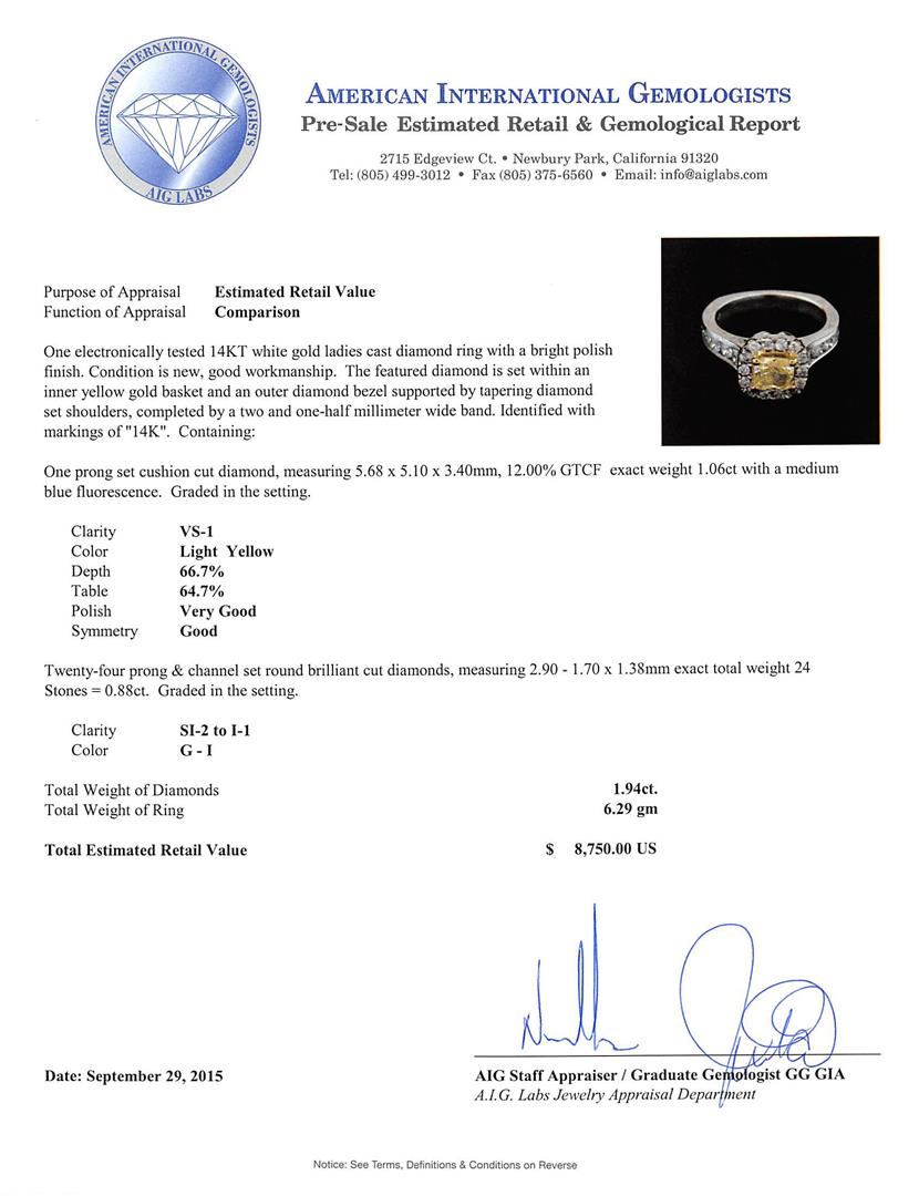 One electronically tested 14KT white gold ladies cast diamond ring with a bright polish finish. The featured diamond is set within an inner yellow gold basket and an outer diamond bezel supported by tapering diamond set shoulders, completed by a two and one-half millimeter wide band. Identified with markings of "14K". Condition is new, good workmanship. Containing: One prong set cushion cut diamond, measuring 5.68 x 5.10 x 3.40mm, 12.00.%. GTCF exact weight 1.06ct with a medium blue fluorescence. Graded in the setting. Clarity: VS-1. Depth: 66.7%. Table 64.7%. Twenty-Four prong & channel set round brilliant cut diamonds, measuring 2.90 - 1.70 x 1.38mm exact total weight 24 Stones = 0.88ct. Graded in the setting. Clarity: SI-2 to I-1. Color: G - I. Total Weight of Diamonds 1.94ct. Total Weight of Ring 6.29gm. AIG Appraised at $8,750.00.
