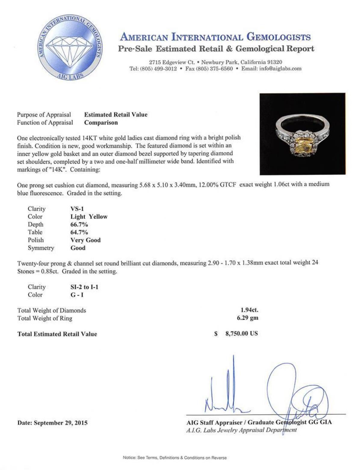 One electronically tested 14KT white gold ladies cast diamond ring with a bright polish finish. The featured diamond is set within an inner yellow gold basket and an outer diamond bezel supported by tapering diamond set shoulders, completed by a two and one-half millimeter wide band. Identified with markings of "14K". Condition is new, good workmanship. Containing: One prong set cushion cut diamond, measuring 5.68 x 5.10 x 3.40mm, 12.00.%. GTCF exact weight 1.06ct with a medium blue fluorescence. Graded in the setting. Clarity: VS-1. Depth: 66.7%. Table 64.7%. Twenty-Four prong & channel set round brilliant cut diamonds, measuring 2.90 - 1.70 x 1.38mm exact total weight 24 Stones = 0.88ct. Graded in the setting. Clarity: SI-2 to I-1. Color: G - I. Total Weight of Diamonds 1.94ct. Total Weight of Ring 6.29gm. AIG Appraised.