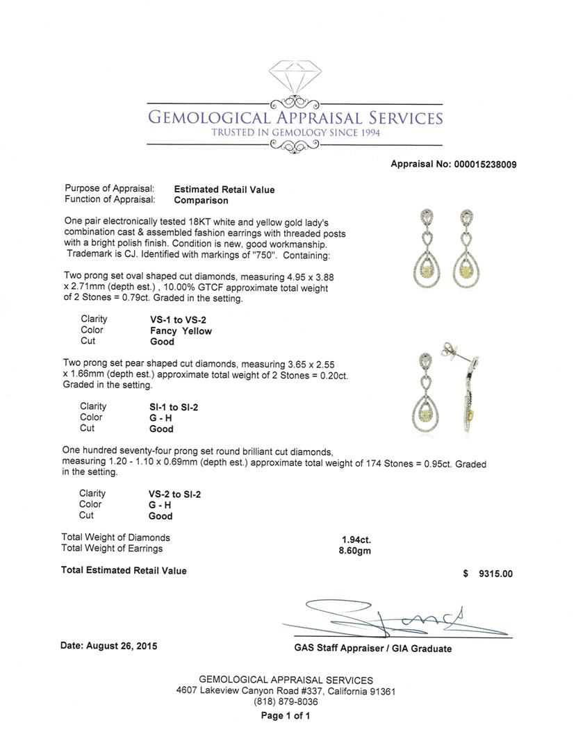 One pair electronically tested 18KT white and yellow gold lady's combination cast & assembled fashion earrings with threaded posts with a bright polish finish. Trademark is CJ. Identified with markings of "750". Condition is new, good workmanship. Containing: Two prong set oval shaped cut diamonds, measuring 4.95 x 3.88 x 2.71mm (depth est.) , 10.00.% GTCF approximate total weight of 2 Stones = 0.79ct. Graded in the setting. Clarity: VS-1 to VS-2 Cut Good Two prong set pear shaped cut diamonds, measuring 3.65 x 2.55 x 1.66mm (depth est.) approximate total weight of 2 Stones = 0.20ct. Graded in the setting. Clarity: SI-1 to SI-2. Color: G - Good One Hundred Seventy-Four prong set round brilliant cut diamonds, measuring 1.20 - 1.10 x 0.69mm (depth est.) approximate total weight of 174 Stones = 0.95ct. Graded in the setting. Clarity: VS-2 to SI-2. Color: G - Good. Total Weight of Diamonds 1.94ct. Total Weight of Earrings 8.60gm. GAS Appraised at $9,315.00.