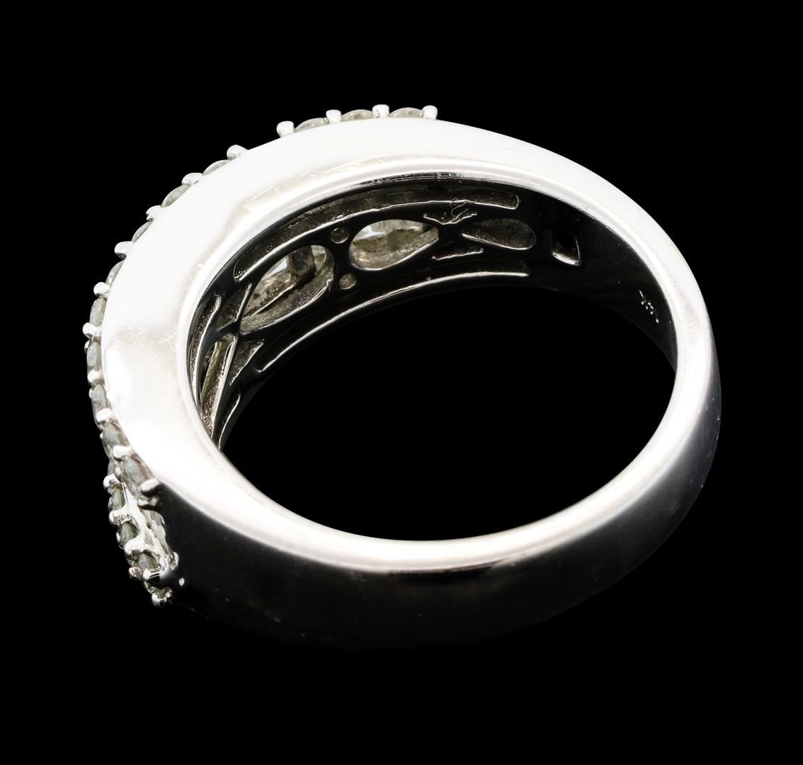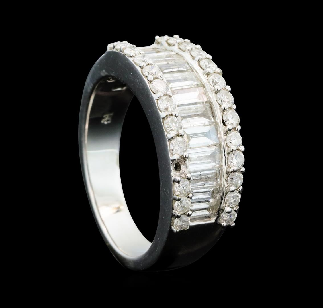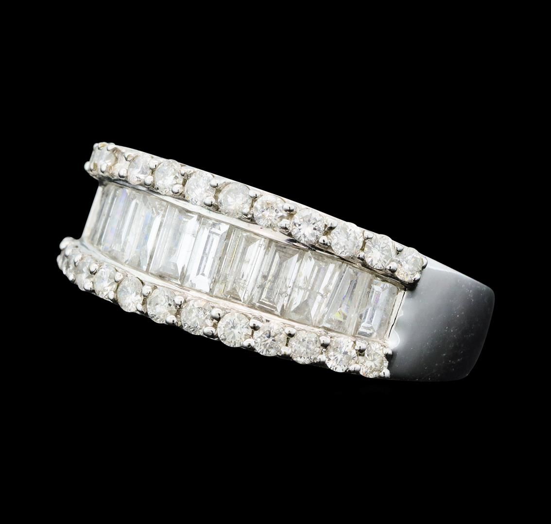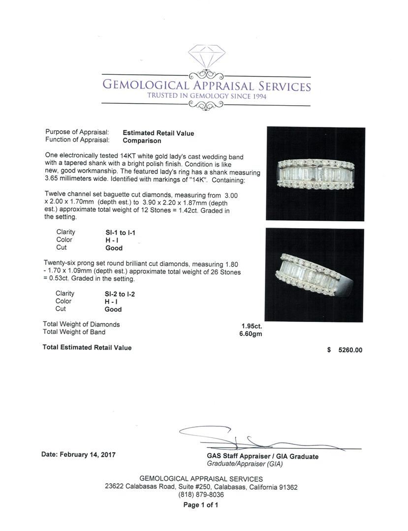 One electronically tested 14KT white gold lady's cast wedding band with a tapered shank with a bright polish finish. The featured lady's ring has a shank measuring 3.65 millimeters wide. Identified with markings of '14K'. Condition is like new, good workmanship. Containing: Twelve channel set baguette cut diamonds, measuring from 3.00 x 2.00 x 1.70mm (depth est.) to 3.90 x 2.20 x 1.87mm (depth est.) approximate total weight of 12 Stones = 1.42ct. Graded in the setting. Clarity SI-1 to I-1. Color: H - I Cut Good Twenty-Six prong set round brilliant cut diamonds, measuring 1.80 - 1.70 x 1.09mm (depth est.) approximate total weight of 26 Stones = 0.53ct. Graded in the setting. Clarity SI-2 to I-2. Color: H - I Cut Good. Total Weight of Diamonds 1.95ct.. Total Weight of Band 6.60gm. GAS Appraised at $5,260.00.