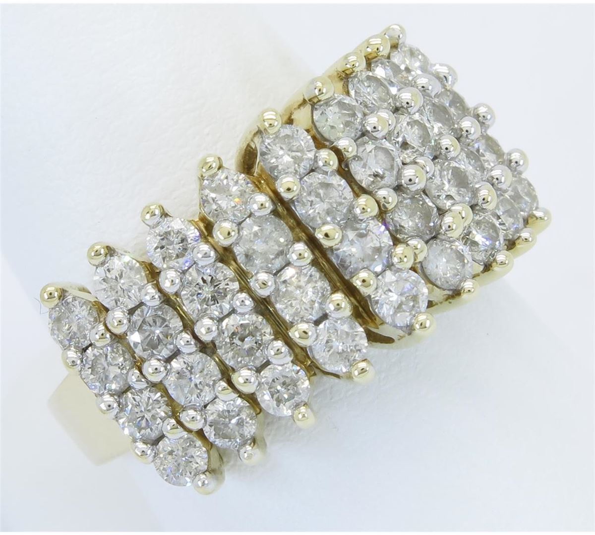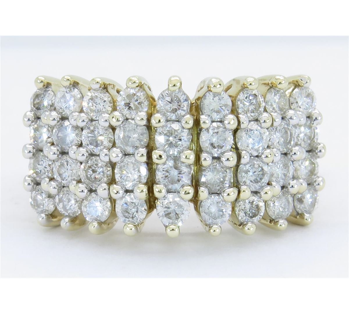One tested 14K yellow gold diamond ring. Containing: 36 Round Brilliant Cut Diamonds. Clarity: I, Color: G-H. Approximate total diamond weight: 1.95CTW. Diamonds are graded in the mounting, unless otherwise stated. Weight of ring: 7.6 grams. Size: 7.75.