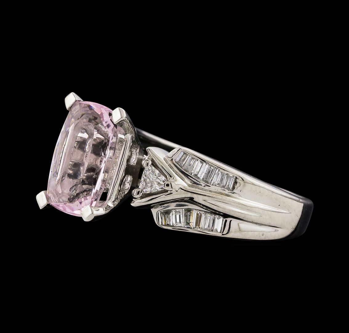 One Morganite and Diamond Ring featuring: 14KT White Gold with a total weight of 5.81 grams, Morganite with a total weight of 1.95ct, and side diamonds with a total weight of 0.50ctw.