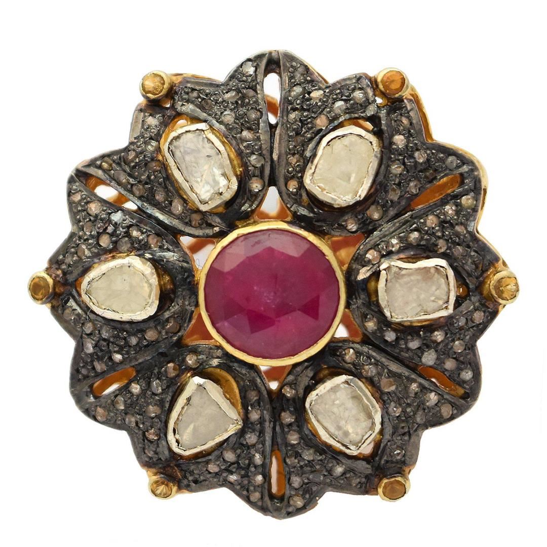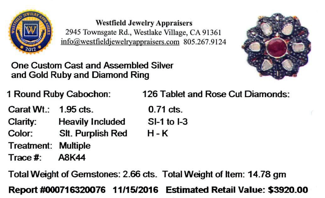 One electronically tested silver and gold ladies custom cast & assembled ruby and diamond ring. The featured ruby is set within a diamond set flower motif supported by a lattice under gallery, completed by a two millimeter wide band. Bright and anodized finish. Condition is new, good workmanship. One bezel set round cabochon cut natural ruby, measuring 8.50 x 8.50 x 2.50mm, approximate weight of 1.95ct., clarity is heavily included, type II, medium dark, very slightly brownish, slightly purplish red color, (GIA slpR 6/3), cut is good. Transmitting light somewhat diffusely, transparent to translucent. Naturally occurring internal & external characteristics are present. Indications of laboratory high temperature heat treatment, with glass & flux additives. Graded in the setting. Ruby has a low tolerance to rhodium plating, repolishing the surface, & ultrasonic cleaning. Six illusion set rose tablet cut diamonds (depth est.) approximate total weight of 6 Stones = 0.25ct. Graded in the setting. Clarity SI-2 to I-2 Color H - J One Hundred Twenty bead set rose cut diamonds, measuring 1.00 - 1.00 x 0.62mm (depth est.) approximate total weight of 120 Stones = 0.46ct. Graded in the setting. Clarity I-1 to I-3 Color H - K