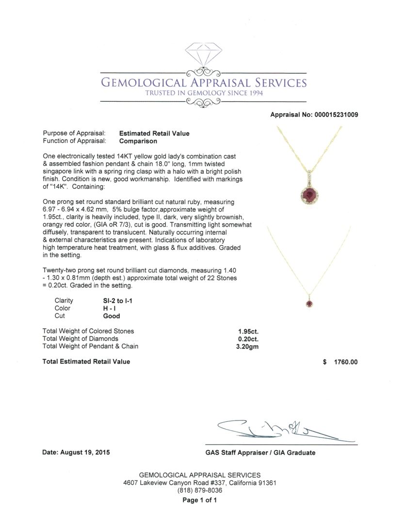 One electronically tested 14KT yellow gold lady's combination cast & assembled fashion pendant & chain 18.0" long, 1mm twisted Singapore link with a spring ring clasp with a halo with a bright polish finish. Identified with markings of "14K". Condition is new, good workmanship. Containing: One prong set round standard brilliant cut natural ruby, measuring 6.97 - 6.94 x 4.62 mm, 5% bulge factor, approximate weight of 1.95ct., clarity is heavily included, type II, dark, very slightly brownish, orangy red color, (GIA oR 7/3), cut is good. Transmitting light somewhat diffusely, transparent to translucent. Naturally occurring internal & external characteristics are present. Indications of laboratory high temperature heat treatment, with glass & flux additives. Graded in the setting. Twenty-Two prong set round brilliant cut diamonds, measuring 1.40 - 1.30 x 0.81mm (depth est.) approximate total weight of 22 Stones = 0.20ct. Graded in the setting. Clarity: SI-2 to I-1. Color: H - I. Cut Good. Total Weight of Colored Stones 1.95ct. Total Weight of Diamonds 0.20ct. Total Weight of Pendant & Chain 3.20gm. GAS Appraised at $1,760.00.