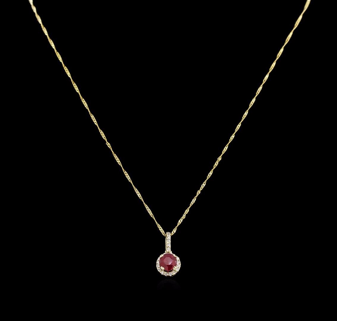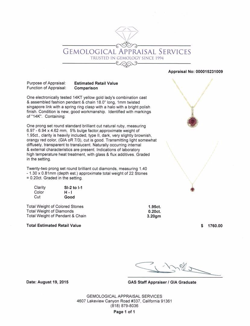 One electronically tested 14KT yellow gold lady's combination cast & assembled fashion pendant & chain 18.0" long, 1mm twisted Singapore link with a spring ring clasp with a halo with a bright polish finish. Identified with markings of "14K". Condition is new, good workmanship. Containing: One prong set round standard brilliant cut natural ruby, measuring 6.97 - 6.94 x 4.62 mm, 5% bulge factor, approximate weight of 1.95ct., clarity is heavily included, type II, dark, very slightly brownish, orangy red color, (GIA oR 7/3), cut is good. Transmitting light somewhat diffusely, transparent to translucent. Naturally occurring internal & external characteristics are present. Indications of laboratory high temperature heat treatment, with glass & flux additives. Graded in the setting. Twenty-Two prong set round brilliant cut diamonds, measuring 1.40 - 1.30 x 0.81mm (depth est.) approximate total weight of 22 Stones = 0.20ct. Graded in the setting. Clarity: SI-2 to I-1. Color: H - I. Cut Good. Total Weight of Colored Stones 1.95ct. Total Weight of Diamonds 0.20ct. Total Weight of Pendant & Chain 3.20gm. GAS Appraised at $1,760.00.