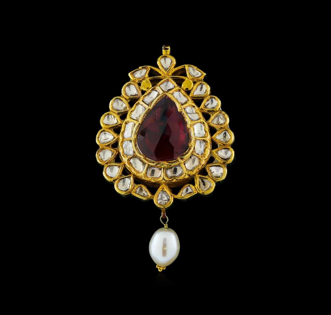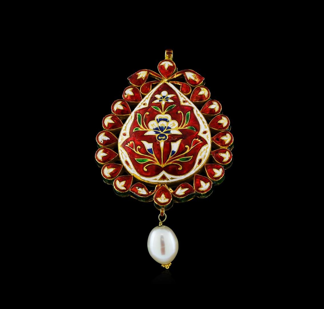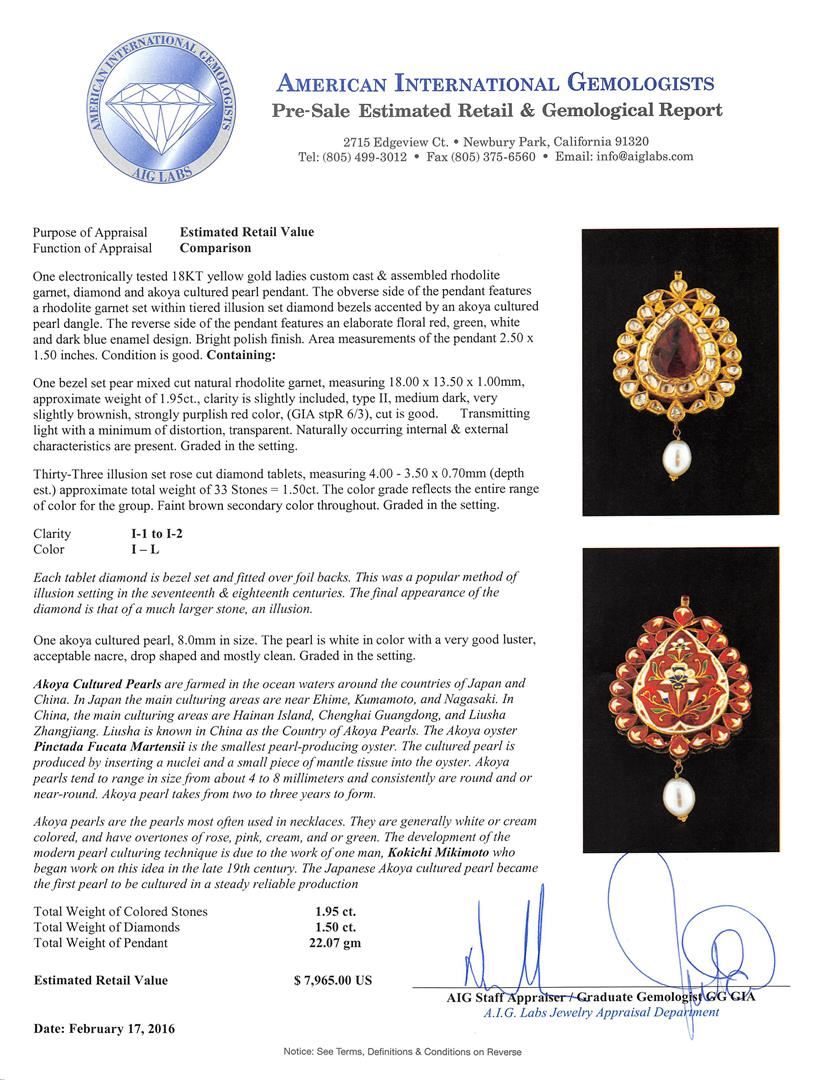 One electronically tested 18KT yellow gold ladies custom cast & assembled rhodolite garnet, diamond and akoya cultured pearl pendant. The obverse side of the pendant features a rhodolite garnet set within tiered illusion set diamond bezels accented by an akoya cultured pearl dangle. The reverse side of the pendant features an elaborate floral red, green, white and dark blue enamel design. Bright polish finish. Area measurements of the pendant 2.50 x 1.50 inches. Condition is good. Containing: One bezel set pear mixed cut natural rhodolite garnet, measuring 18.00 x 13.50 x 1.00mm, approximate weight of 1.95ct., clarity is slightly included, type II, medium dark, very slightly brownish, strongly purplish red color, (GIA stpR 6/3), cut is good. Transmitting light with a minimum of distortion, transparent. Naturally occurring internal & external characteristics are present. Graded in the setting. Thirty-Three illusion set rose cut diamonds, measuring 4.00 - 3.50 x 0.70mm (depth est.) approximate total weight of 33 Stones = 1.50ct. Faint brown secondary color throughout. Graded in the setting. Clarity: I-1 to I-2. Color: I - L One akoya cultured pearl, 8.0mm in size. The pearl is white in color with a very good luster, acceptable nacre, off round, mostly clean Graded in the setting. Total Weight of Colored Stones 1.95ct. Total Weight of Diamonds 1.50ct. Total Weight of Pendant 22.07gm. AIG Appraised at $7,965.00.
