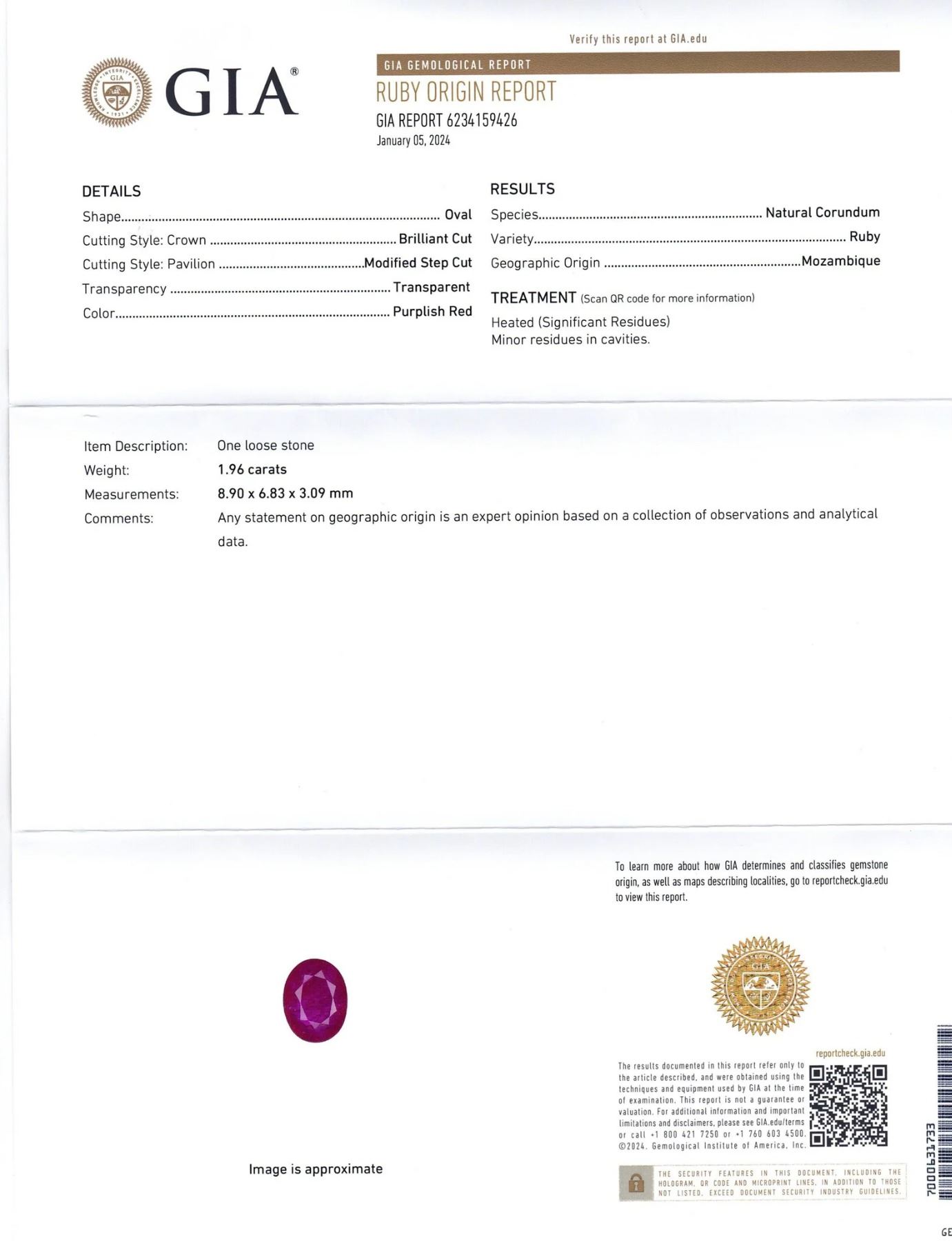 This Natural Ruby is a 1.96 Ct. Oval Cut Measuring 8.90 x 6.83 x 3.09 mm. This ruby is transparent and would go well in any setting, or maybe just alone to admire. What ever the reason, this fine gemstone can be yours! Please see the Gia Certification for additional information.