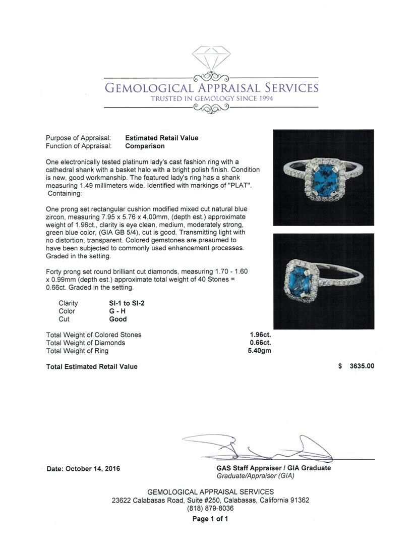 One electronically tested platinum lady's cast fashion ring with a cathedral shank with a basket halo with a bright polish finish. The featured lady's ring has a shank measuring 1.49 millimeters wide. Identified with markings of 'PLAT'. Condition is new, good workmanship. Containing: One prong set rectangular cushion modified mixed cut natural blue zircon, measuring 7.95 x 5.76 x 4.00mm, (depth est.) approximate weight of 1.96ct., clarity is eye clean, medium, moderately strong, green blue color, (GIA GB 5/4), cut is good. Transmitting light with no distortion, transparent. Colored gemstones are presumed to have been subjected to commonly used enhancement processes. Graded in the setting. Forty prong set round brilliant cut diamonds, measuring 1.70 - 1.60 x 0.99mm (depth est.) approximate total weight of 40 Stones = 0.66ct. Graded in the setting. Clarity SI-1 to SI-2. Color: G - H Cut Good. Total Weight of Colored Stones 1.96ct.. Total Weight of Diamonds 0.66ct.. Total Weight of Ring 5.40gm. GAS Appraised at $3,635.00.