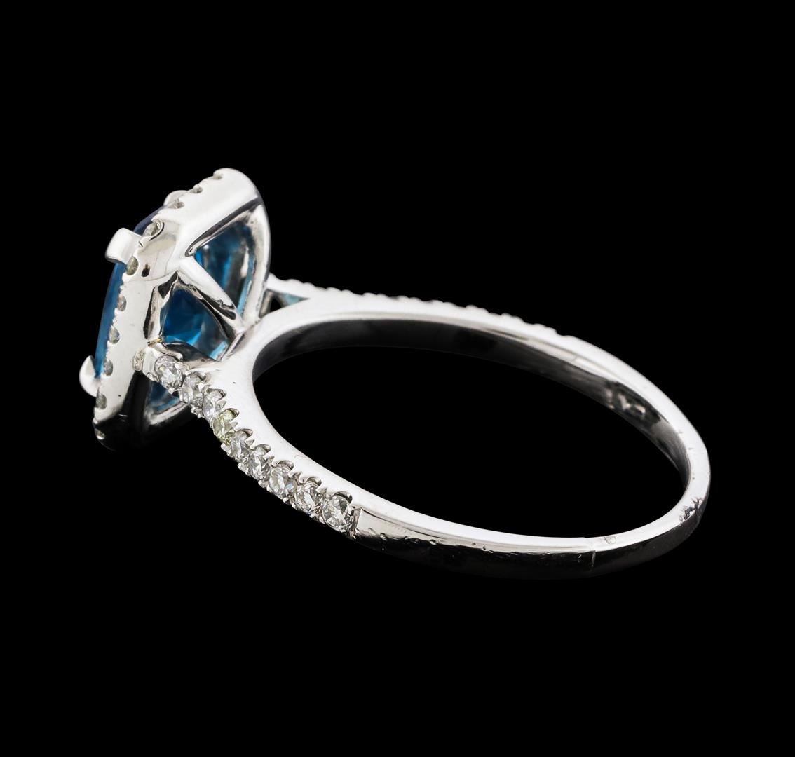One electronically tested platinum lady's cast fashion ring with a cathedral shank with a basket halo with a bright polish finish. The featured lady's ring has a shank measuring 1.49 millimeters wide. Identified with markings of 'PLAT'. Condition is new, good workmanship. Containing: One prong set rectangular cushion modified mixed cut natural blue zircon, measuring 7.95 x 5.76 x 4.00mm, (depth est.) approximate weight of 1.96ct., clarity is eye clean, medium, moderately strong, green blue color, (GIA GB 5/4), cut is good. Transmitting light with no distortion, transparent. Colored gemstones are presumed to have been subjected to commonly used enhancement processes. Graded in the setting. Forty prong set round brilliant cut diamonds, measuring 1.70 - 1.60 x 0.99mm (depth est.) approximate total weight of 40 Stones = 0.66ct. Graded in the setting. Clarity SI-1 to SI-2. Color: G - H Cut Good. Total Weight of Colored Stones 1.96ct.. Total Weight of Diamonds 0.66ct.. Total Weight of Ring 5.40gm. GAS Appraised at $3,635.00.