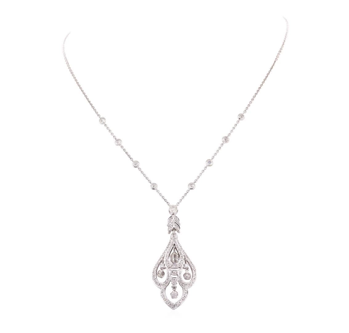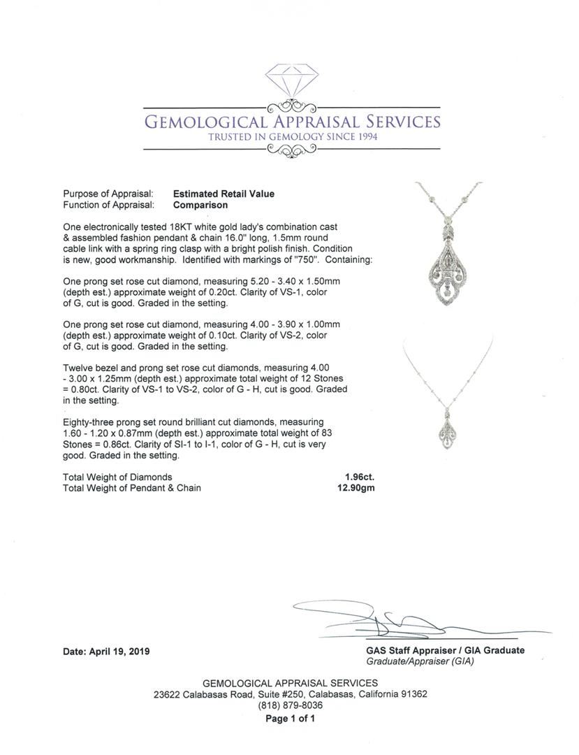One electronically tested 18KT white gold lady's combination cast & assembled fashion pendant & chain 16.0' long, 1.5mm round cable link with a spring ring clasp with a bright polish finish. Identified with markings of '750'. Condition is new, good workmanship. Containing: One prong set rose cut diamond, measuring 5.20 - 3.40 x 1.50mm (depth est.) approximate weight of 0.20ct. Graded in the setting. Color G Clarity VS-1 Cut Good One prong set rose cut diamond, measuring 4.00 - 3.90 x 1.00mm (depth est.) approximate weight of 0.10ct. Graded in the setting. Color G Clarity VS-2 Cut Good Twelve bezel and prong set rose cut diamonds, measuring 4.00 - 3.00 x 1.25mm (depth est.) approximate total weight of 12 Stones = 0.80ct. Graded in the setting. Color G - H Clarity VS-1 to VS-2 Cut Good Eighty-Three prong set round brilliant cut diamonds, measuring 1.60 - 1.20 x 0.87mm (depth est.) approximate total weight of 83 Stones = 0.86ct. Graded in the setting. Color G - H Clarity SI-1 to I-1 Cut Very Good. Total Weight of Diamonds 1.96ct.. Total Weight of Pendant & Chain 12.90gm GAS Appraised at $6735.00. GAS Appraised at $23,795.00.