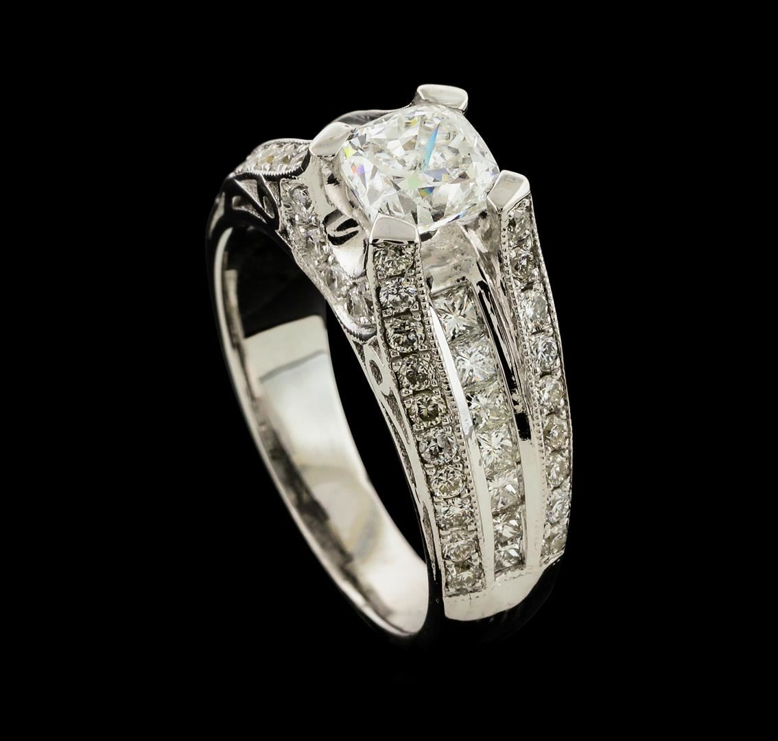 One electronically tested 18KT white gold lady's cast wedding ring with a split cathedral shank with a bright polish with milgrain detailing finish. The featured lady's ring has a shank measuring 3.50 millimeters wide. Identified with markings of '18K'. Condition is new, good workmanship. Containing: One prong set cushion cut diamond, measuring 5.44 x 5.28 x 3.89mm (depth est.) approximate weight of 0.96ct. Graded in the setting. Clarity I-1. Color: I Cut Good Fourteen channel set princess cut diamonds, measuring 2.10 x 1.50 x 1.13mm (depth est.) approximate total weight of 14 Stones = 0.47ct. Graded in the setting. Clarity VS-1 to VS-2. Color: G - I Cut Very Good Forty-Six prong set round brilliant cut diamonds, measuring 1.50 - 1.40 x 0.90mm (depth est.) approximate total weight of 46 Stones = 0.53ct. Graded in the setting. Clarity VS-2 to SI-1. Color: H - I Cut Good. Total Weight of Diamonds 1.96ct.. Total Weight of Ring 7.10gm. GAS Appraised at $11,045.00.