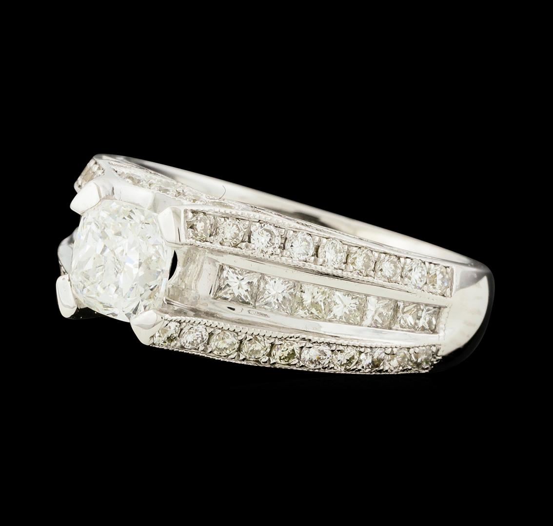 One electronically tested 18KT white gold lady's cast wedding ring with a split cathedral shank with a bright polish with milgrain detailing finish. The featured lady's ring has a shank measuring 3.50 millimeters wide. Identified with markings of '18K'. Condition is new, good workmanship. Containing: One prong set cushion cut diamond, measuring 5.44 x 5.28 x 3.89mm (depth est.) approximate weight of 0.96ct. Graded in the setting. Clarity I-1. Color: I Cut Good Fourteen channel set princess cut diamonds, measuring 2.10 x 1.50 x 1.13mm (depth est.) approximate total weight of 14 Stones = 0.47ct. Graded in the setting. Clarity VS-1 to VS-2. Color: G - I Cut Very Good Forty-Six prong set round brilliant cut diamonds, measuring 1.50 - 1.40 x 0.90mm (depth est.) approximate total weight of 46 Stones = 0.53ct. Graded in the setting. Clarity VS-2 to SI-1. Color: H - I Cut Good. Total Weight of Diamonds 1.96ct.. Total Weight of Ring 7.10gm. GAS Appraised at $11,045.00.