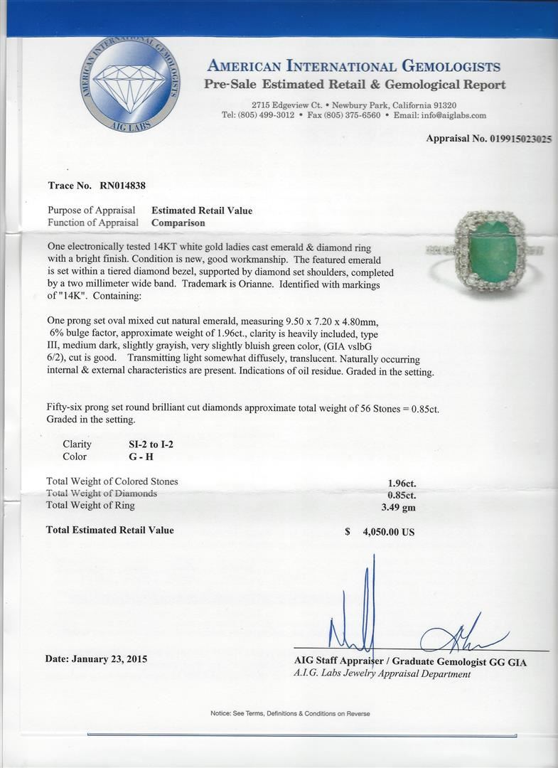 One 1.96ct Emerald and Diamond Ring - 14KT White Gold. AIG certified. See Appraisal for more details. AIG Appraised.