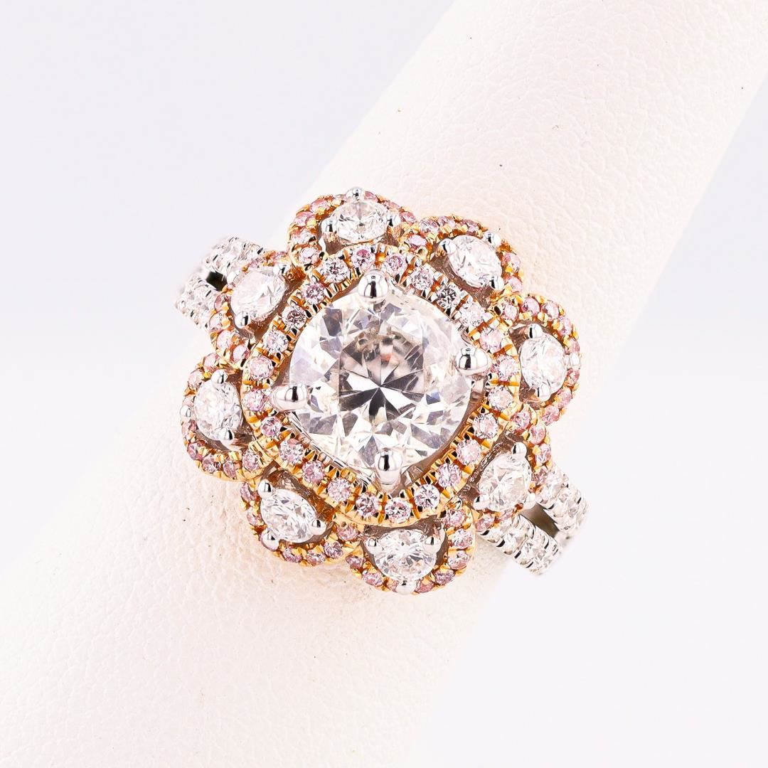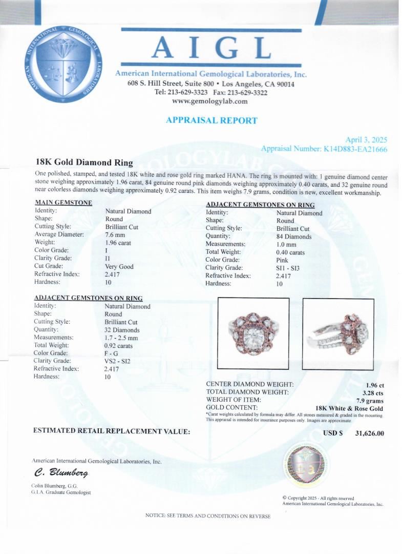 One polished, stamped, and tested 18K white and rose gold ring marked HANA. The ring is mounted with: 1 genuine diamond center stone weighing approximately 1.96 carat, 84 genuine round pink diamonds weighing approximately 0.40 carats, and 32 genuine round near colorless diamonds weighing approximately 0.92 carats. This item weighs 7.9 grams, condition is new, excellent workmanship. #MAIN GEMSTONE# Identity: Natural Diamond Shape: Round Cutting Style: Brilliant Cut Average Diameter: 7.6mm Weight: 1.96 carat Color Grade: I Clarity Grade: I1 Cut Grade: Very Good Refractive Index: 2.417 Hardness: 10 #ADJACENT GEMSTONES ON RING# Identity: Natural Diamond Shape: Round Cutting Style: Brilliant Cut Quantity: 84 Diamonds Measurements: 1.0mm Total Weight: 0.40 carats Color Grade: Pink Clarity Grade: SI1-SI3 Refractive Index: 2.417 Hardness: 10 #ADJACENT GEMSTONES ON RING# Identity: Natural Diamond Shape: Round Cutting Style: Brilliant Cut Quantity: 32 Diamonds Measurements: 1.7 - 2.5mm Total Weight: 0.92 carats Color Grade: F-G Clarity Grade: VS2-SI2 Refractive Index: 2.417 Hardness: 10 #CENTER DIAMOND WEIGHT: 1.96 ct TOTAL DIAMOND WEIGHT: 3.28 cts WEIGHT OF ITEM: 7.9 grams GOLD CONTENT: 18K White & Rose Gold Size: 6 1/2