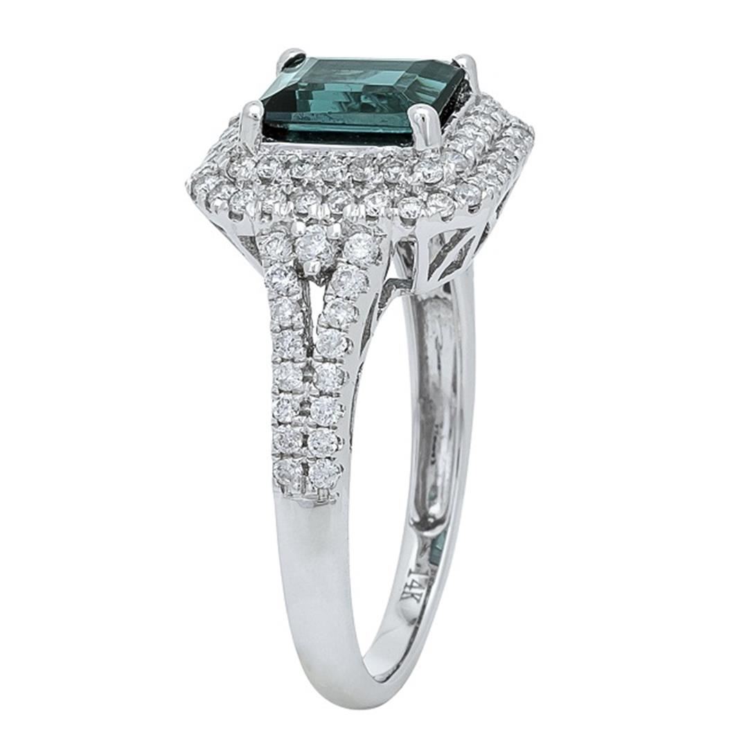 One Indigo and Diamond Ring featuring: 14KT White Gold with a total weight of 3.47 grams, Indigo with a total weight of 1.96ct, and 88 Round Cut Diamonds with a total weight of 0.61ctw.