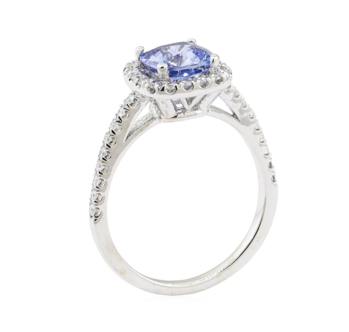 One electronically tested 14KT white gold lady's cast fashion ring with a cathedral basket halo with a bright polish finish. The featured lady's ring has a shank measuring 1.50 millimeters wide. Identified with markings of '14K'. Condition is new, good workmanship. Containing: One prong set square cushion modified mixed cut natural blue sapphire, measuring 6.83 x 6.72 x 3.60mm, (depth est.) approximate weight of 1.56ct., clarity is eye clean, medium light, very slightly grayish, blue color, (GIA B 4/3), cut is good. Transmitting light with no distortion, transparent. Colored gemstones are presumed to have been subjected to commonly used enhancement processes. Graded in the setting. Eighteen prong set round brilliant cut diamonds, measuring 1.50 - 1.45 x 0.92mm (depth est.) approximate total weight of 18 Stones = 0.22ct. Graded in the setting. Color H - I Clarity SI-1 to SI-2 Cut Good Eighteen prong set round brilliant cut diamonds, measuring 1.30 - 1.20 x 0.78mm (depth est.) approximate total weight of 18 Stones = 0.14ct. Graded in the setting. Color G - H Clarity SI-1 to SI-2 Cut Good. Total Weight of Colored Stones 1.56ct.. Total Weight of Diamonds 0.36ct.. Total Weight of Ring 3.50gm GAS Appraised at  $3080.00. GAS Appraised at $3,080.00.