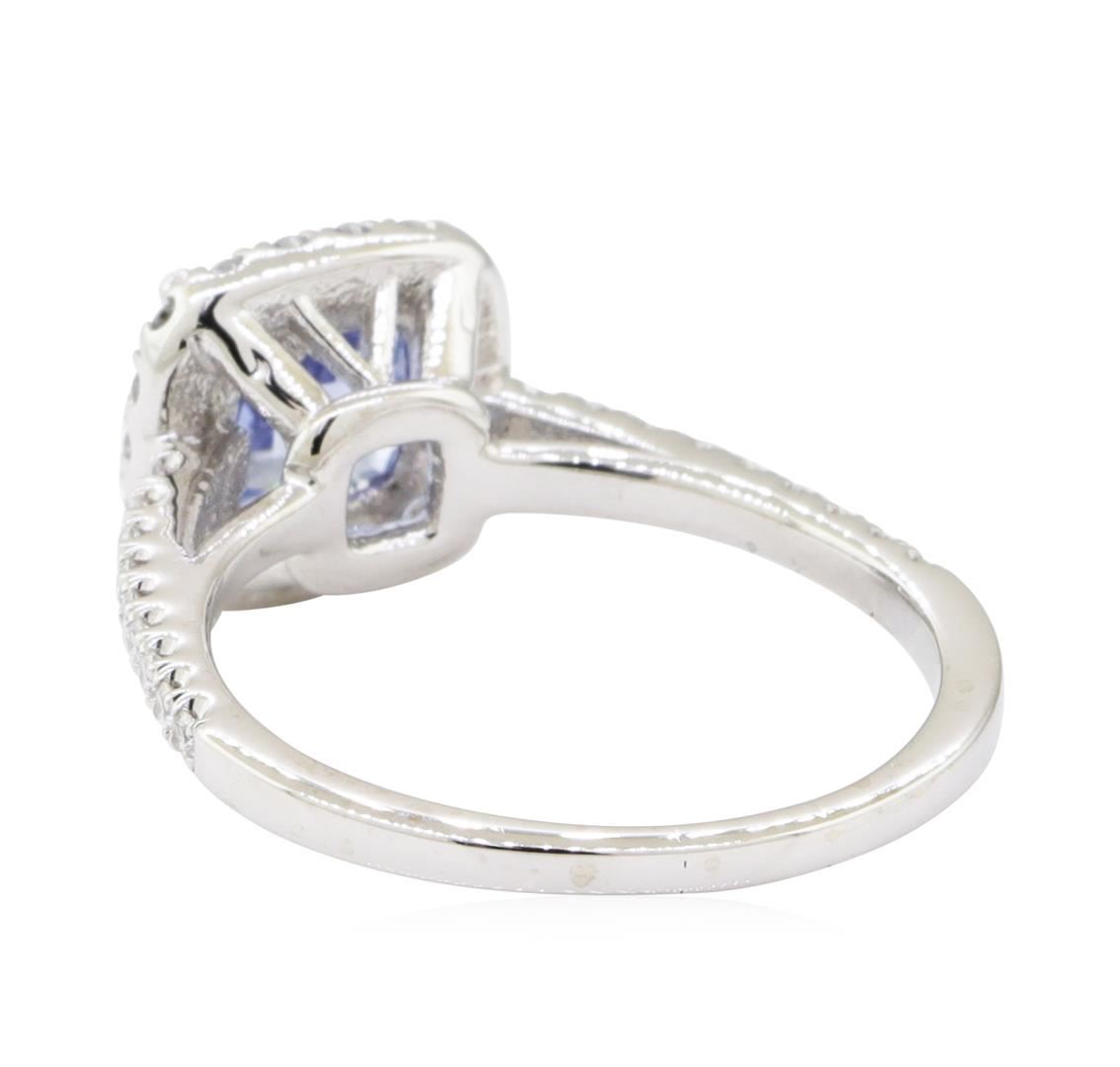 One electronically tested 14KT white gold lady's cast fashion ring with a cathedral basket halo with a bright polish finish. The featured lady's ring has a shank measuring 1.50 millimeters wide. Identified with markings of '14K'. Condition is new, good workmanship. Containing: One prong set square cushion modified mixed cut natural blue sapphire, measuring 6.83 x 6.72 x 3.60mm, (depth est.) approximate weight of 1.56ct., clarity is eye clean, medium light, very slightly grayish, blue color, (GIA B 4/3), cut is good. Transmitting light with no distortion, transparent. Colored gemstones are presumed to have been subjected to commonly used enhancement processes. Graded in the setting. Eighteen prong set round brilliant cut diamonds, measuring 1.50 - 1.45 x 0.92mm (depth est.) approximate total weight of 18 Stones = 0.22ct. Graded in the setting. Color H - I Clarity SI-1 to SI-2 Cut Good Eighteen prong set round brilliant cut diamonds, measuring 1.30 - 1.20 x 0.78mm (depth est.) approximate total weight of 18 Stones = 0.14ct. Graded in the setting. Color G - H Clarity SI-1 to SI-2 Cut Good. Total Weight of Colored Stones 1.56ct.. Total Weight of Diamonds 0.36ct.. Total Weight of Ring 3.50gm GAS Appraised at $3080.00. GAS Appraised at $3,080.00.