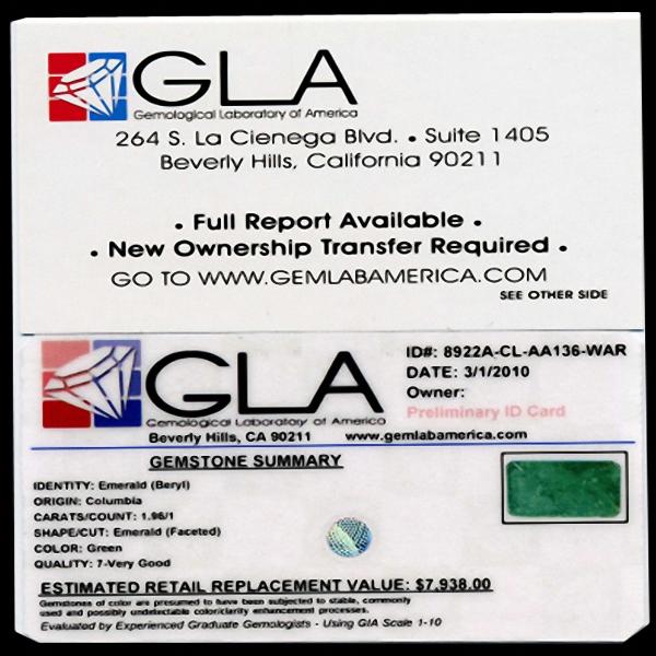 Very good Colombian green specimen standard cut; lab quality evaluation 7; typical treatment likely; Gem Guide wholesale $2646-$4704; full retail appraisal $7938; full lab evaluation available