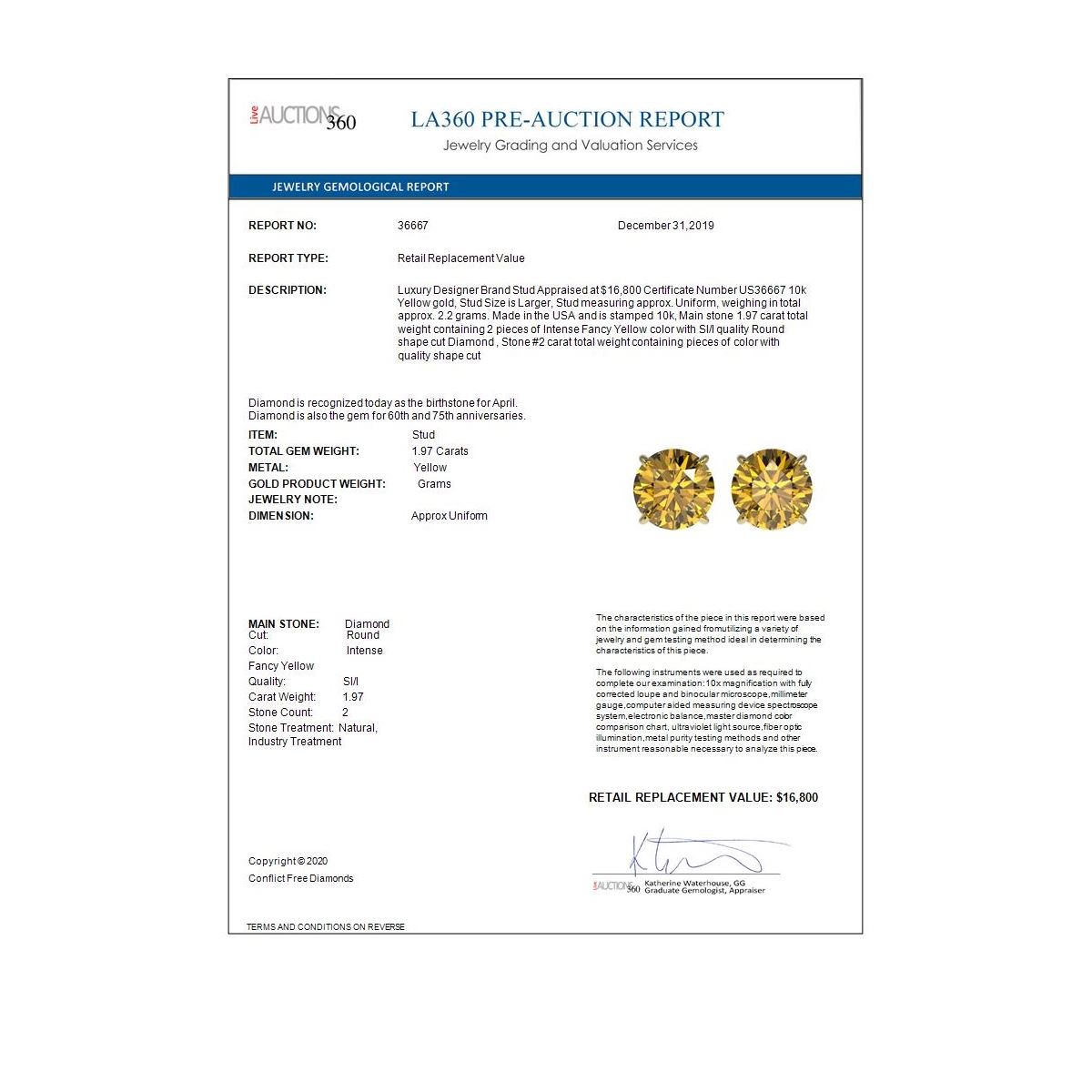 REF-294N5F - SKU: 36667 ---- 1.97 ctw Certified Intense Yellow Diamond Stud Earrings 10k Yellow Gold