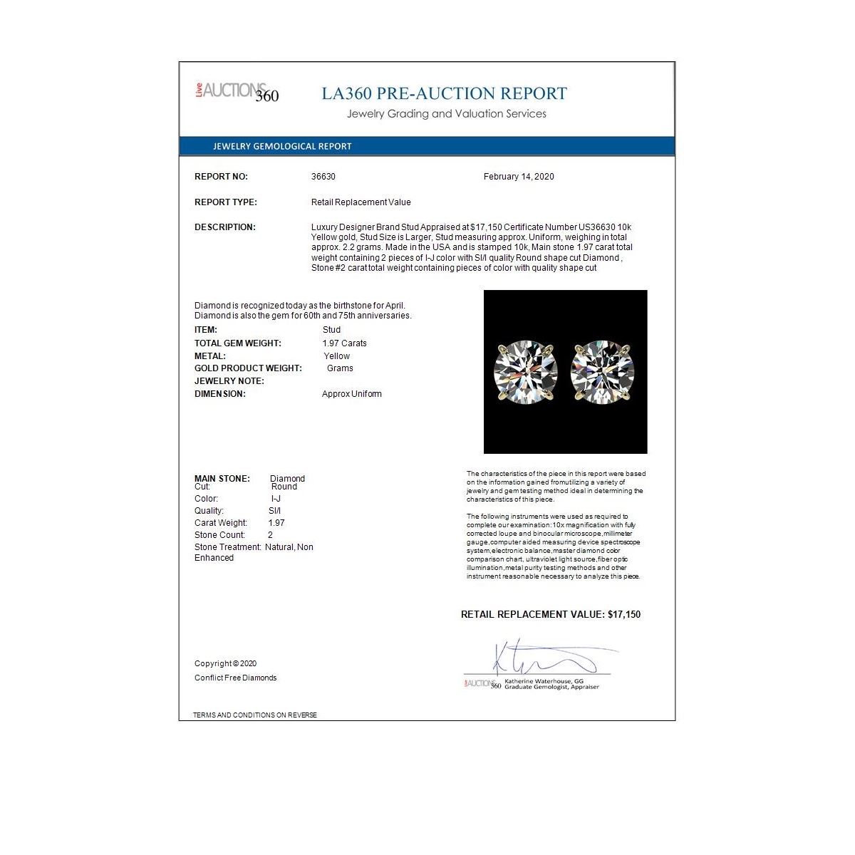 REF-256A3N - SKU: 36630 ---- 1.97 ctw Certified Quality Diamond Stud Earrings 10k Yellow Gold