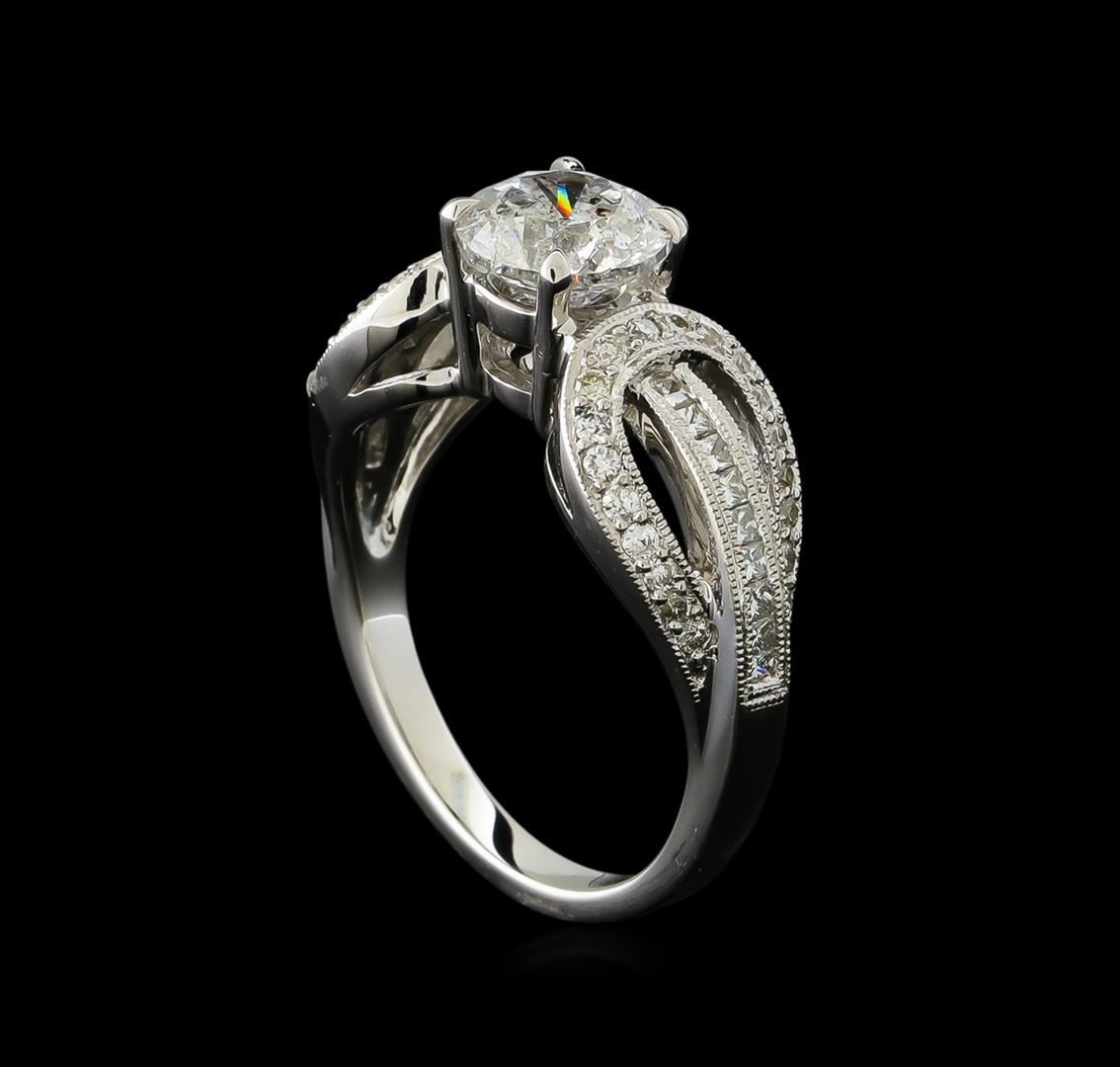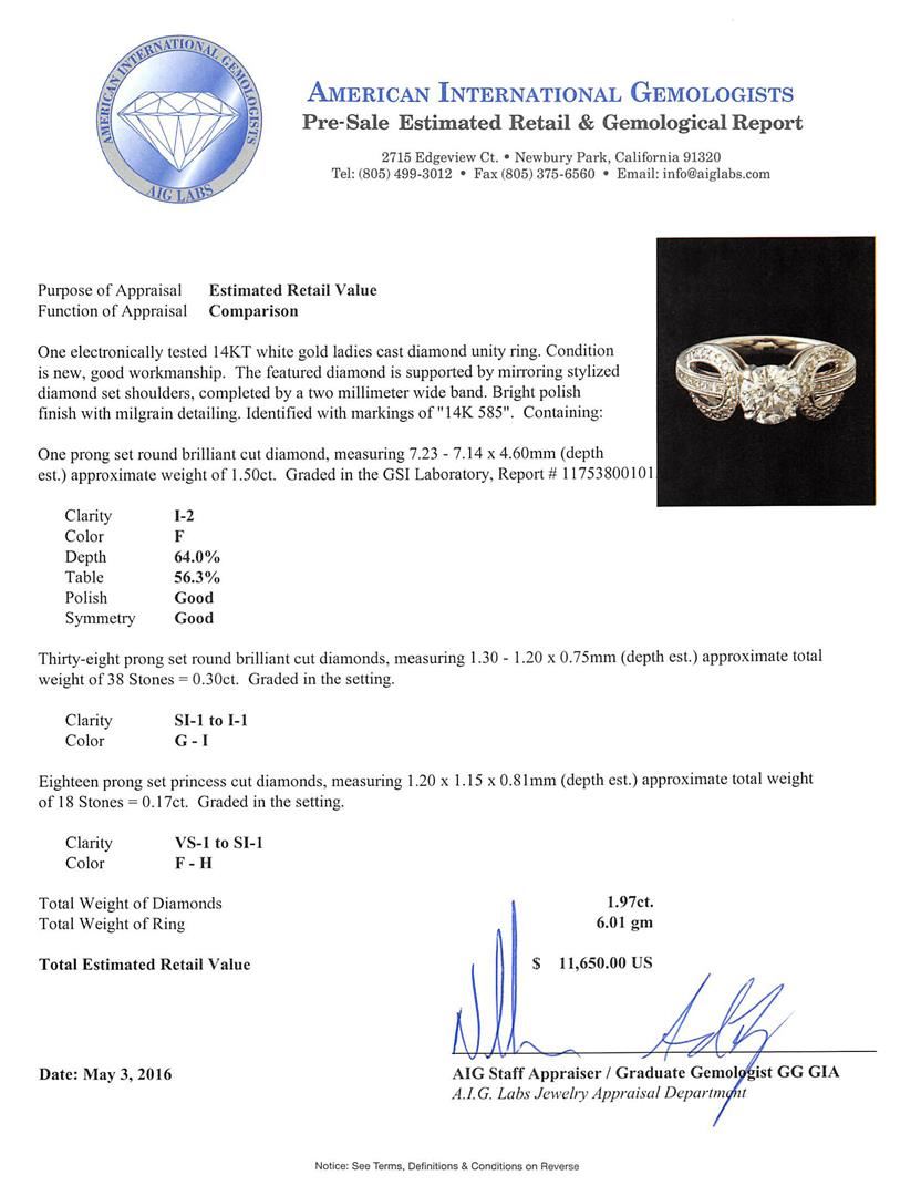 One electronically tested 14KT white gold ladies cast diamond unity ring. The featured diamond is supported by mirroring stylized diamond set shoulders, completed by a two millimeter wide band. Bright polish finish with milgrain detailing. Identified with markings of "14K 585". Condition is new, good workmanship. Containing: One prong set round brilliant cut diamond, measuring 7.23 - 7.14 x 4.60mm (depth est.) approximate weight of 1.50ct. Graded in the GSI Laboratory, Report # 11753800101. Clarity: I-2. Color: F. Depth 64.0%. Table 56.3%. Thirty-Eight prong set round brilliant cut diamonds, measuring 1.30 - 1.20 x 0.75mm (depth est.) approximate total weight of 38 Stones = 0.30ct. Graded in the setting. Clarity: SI-1 to I-1. Color: G - I Eighteen prong set princess cut diamonds, measuring 1.20 x 1.15 x 0.81mm (depth est.) approximate total weight of 18 Stones = 0.17ct. Graded in the setting. Clarity: VS-1 to SI-1. Color: F - H. Total Weight of Diamonds 1.97ct. Total Weight of Ring 6.01gm. AIG Appraised at $11,650.00.