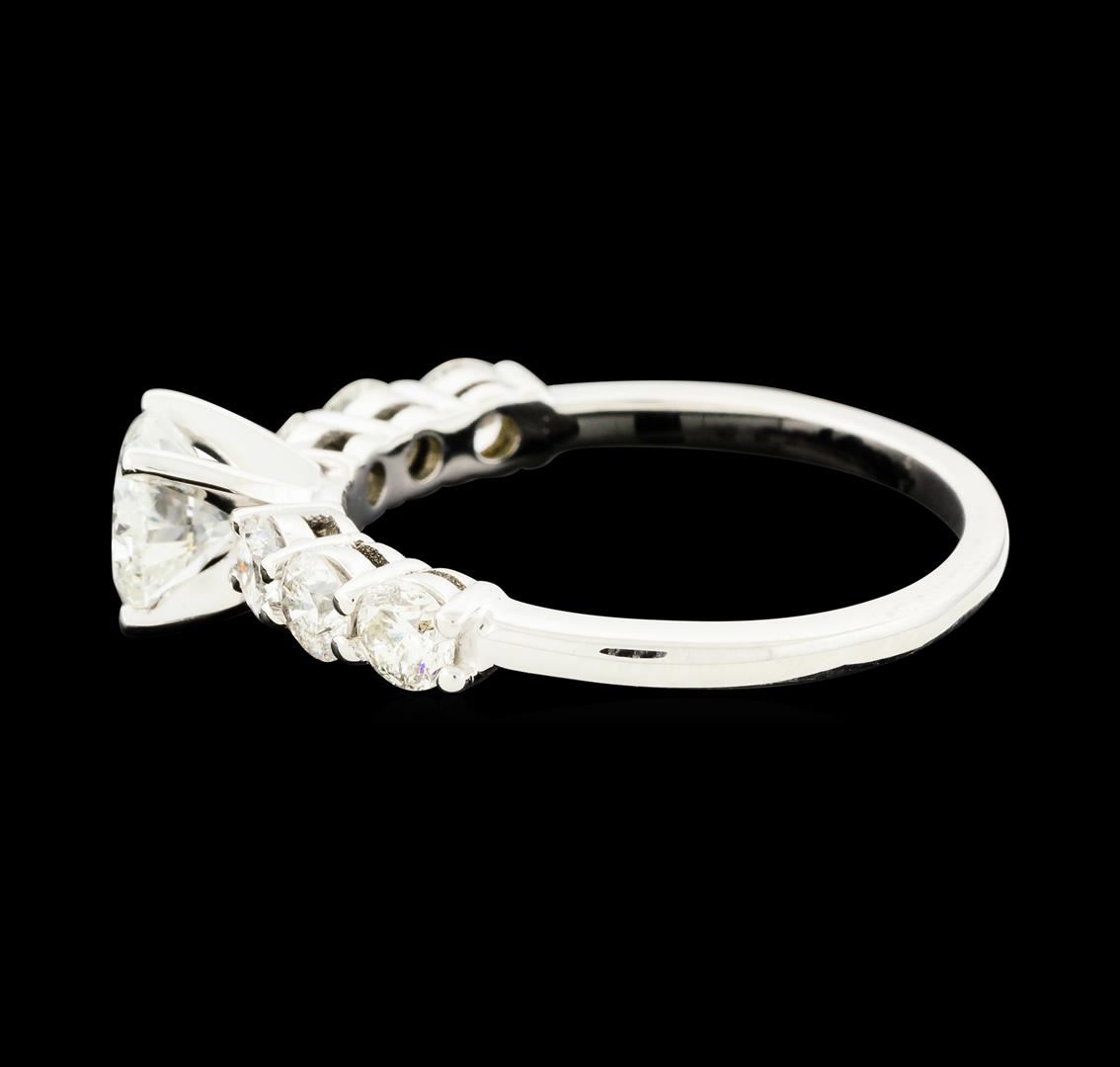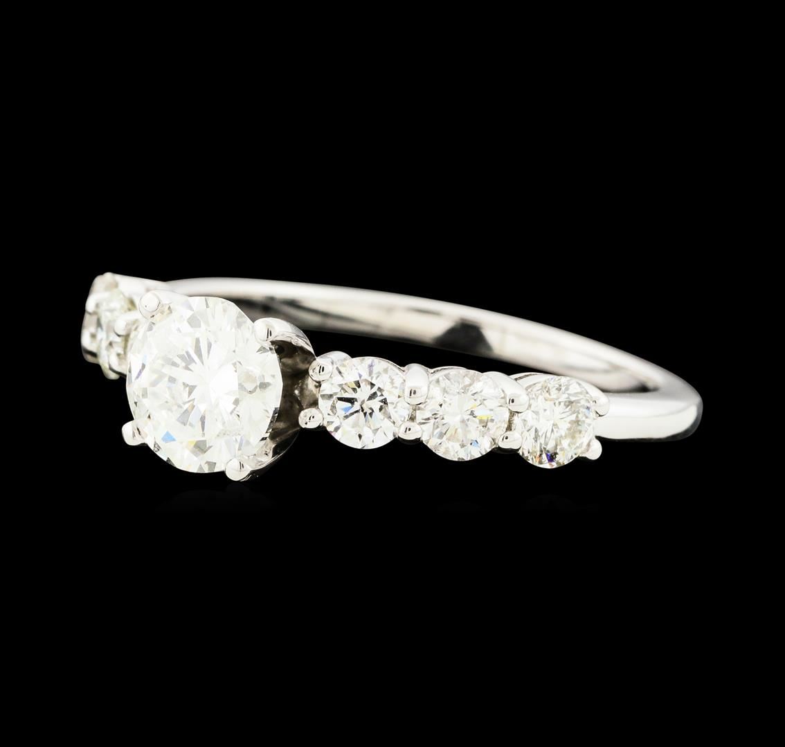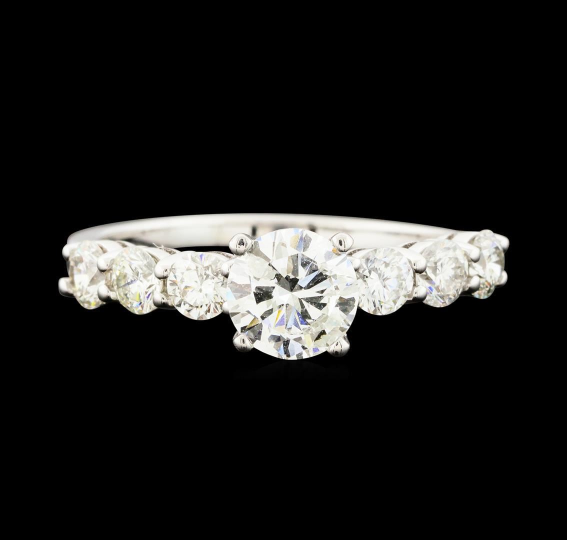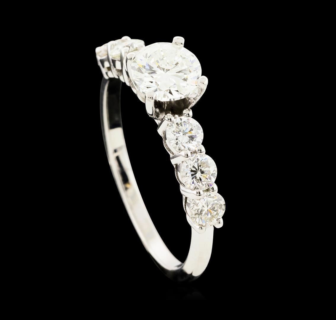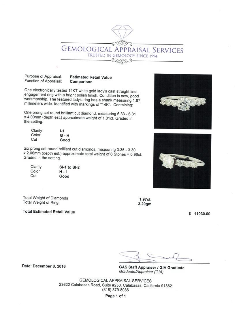 One electronically tested 14KT white gold lady's cast straight line engagement ring with a bright polish finish. The featured lady's ring has a shank measuring 1.67 millimeters wide. Identified with markings of '14K'. Condition is new, good workmanship. Containing: One prong set round brilliant cut diamond, measuring 6.33 - 6.31 x 4.00mm (depth est.) approximate weight of 1.01ct. Graded in the setting. Clarity I-1. Color: G - H Cut Good Six prong set round brilliant cut diamonds, measuring 3.35 - 3.30 x 2.06mm (depth est.) approximate total weight of 6 Stones = 0.96ct. Graded in the setting. Clarity SI-1 to SI-2. Color: H - I Cut Good. Total Weight of Diamonds 1.97ct.. Total Weight of Ring 3.20gm. GAS Appraised at $11,030.00.